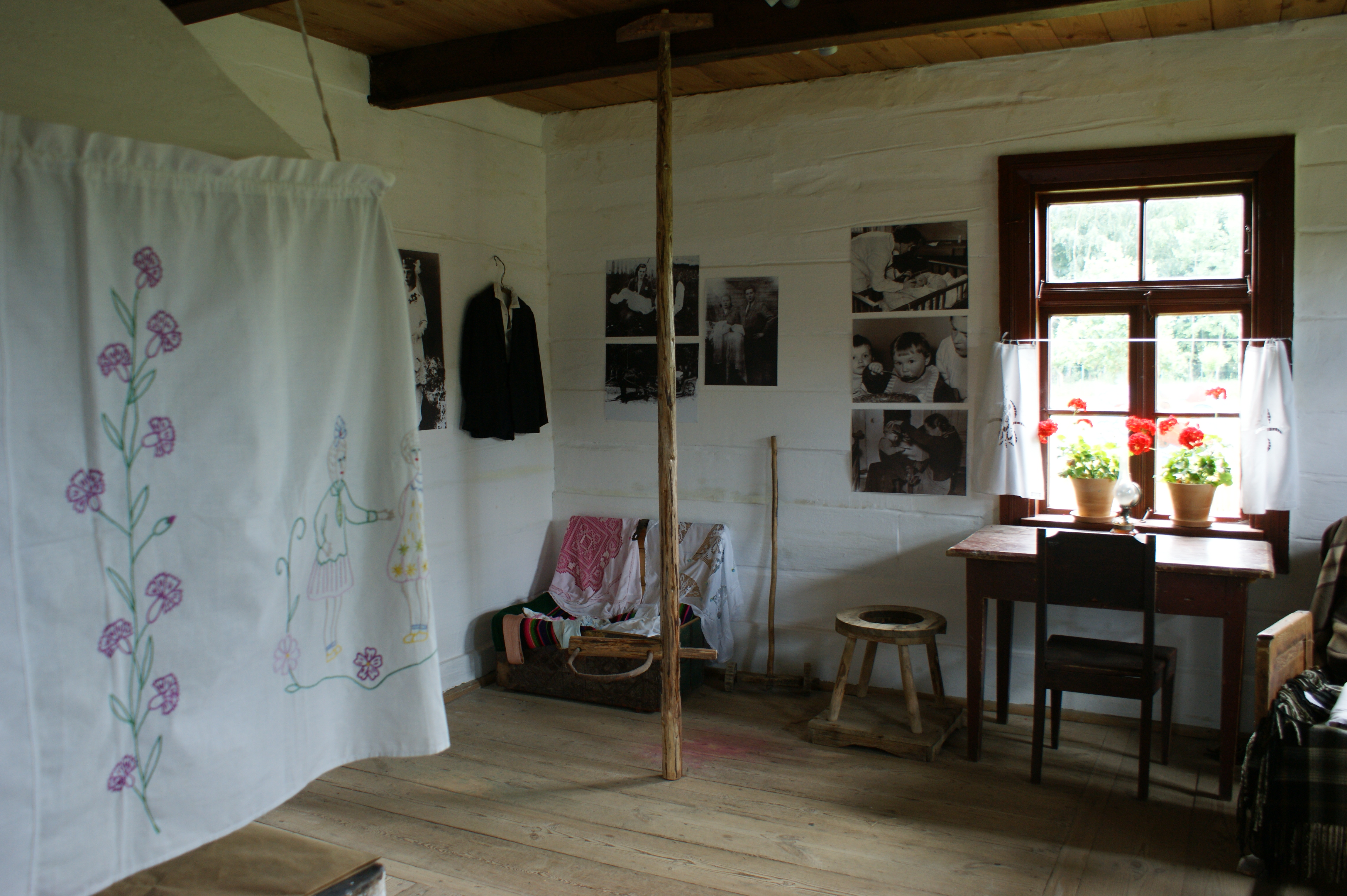 Wystawa „Dziecięce troski i beztroski”. Wnętrze mieszkalne, widoczny chodzik dziecięcy.