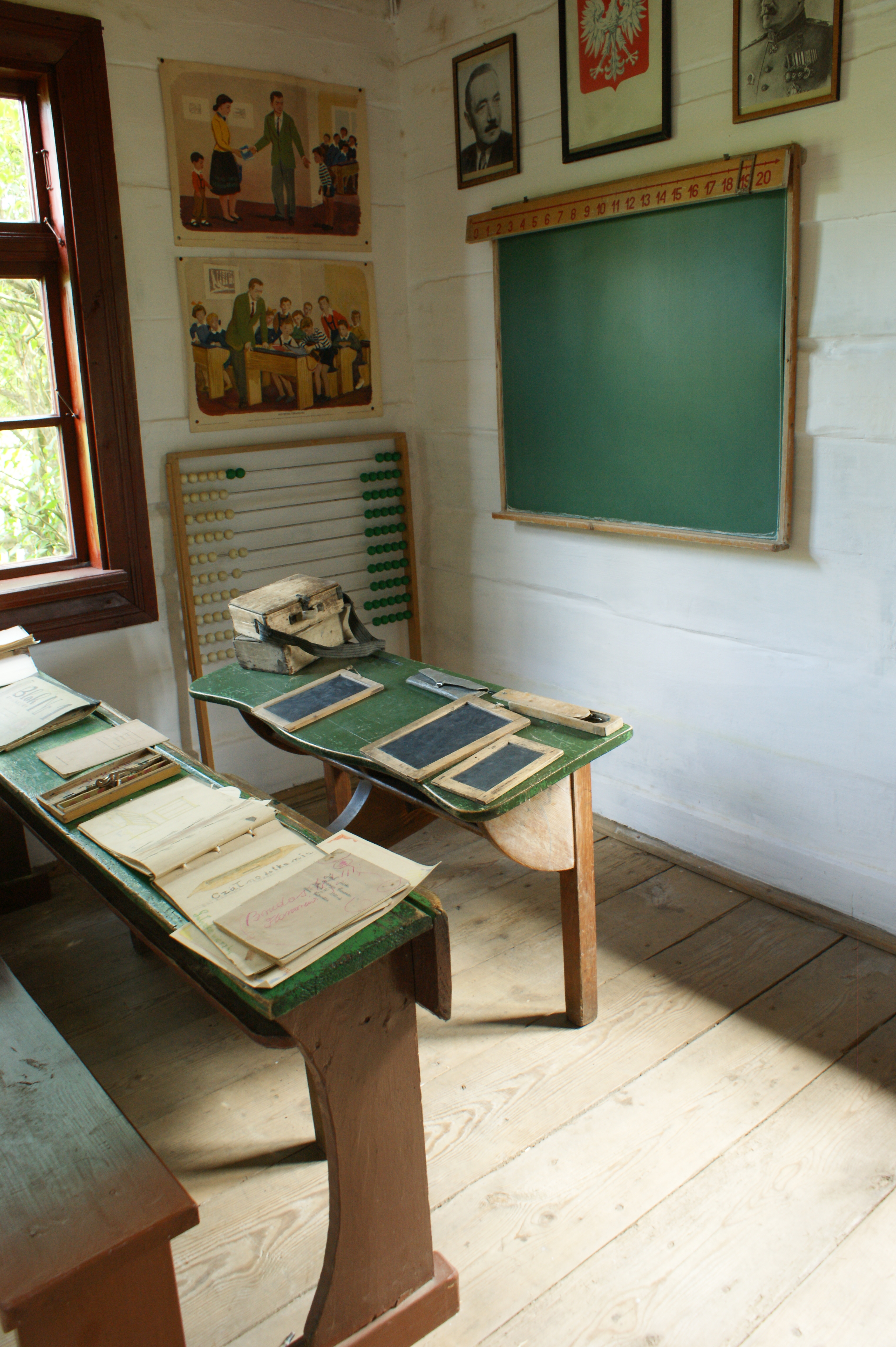 Wystawa „Dziecięce troski i beztroski”. Zrekonstruowana typowa wiejska klasa. Widczone pulpity, tabliczki do pisania, liczydło.