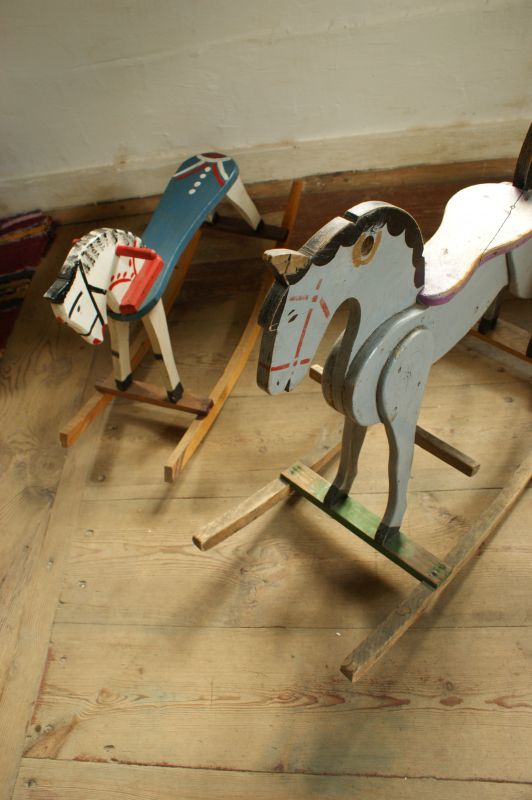 Wystawa „Dziecięce troski i beztroski”: drewniane koniki na biegunach.