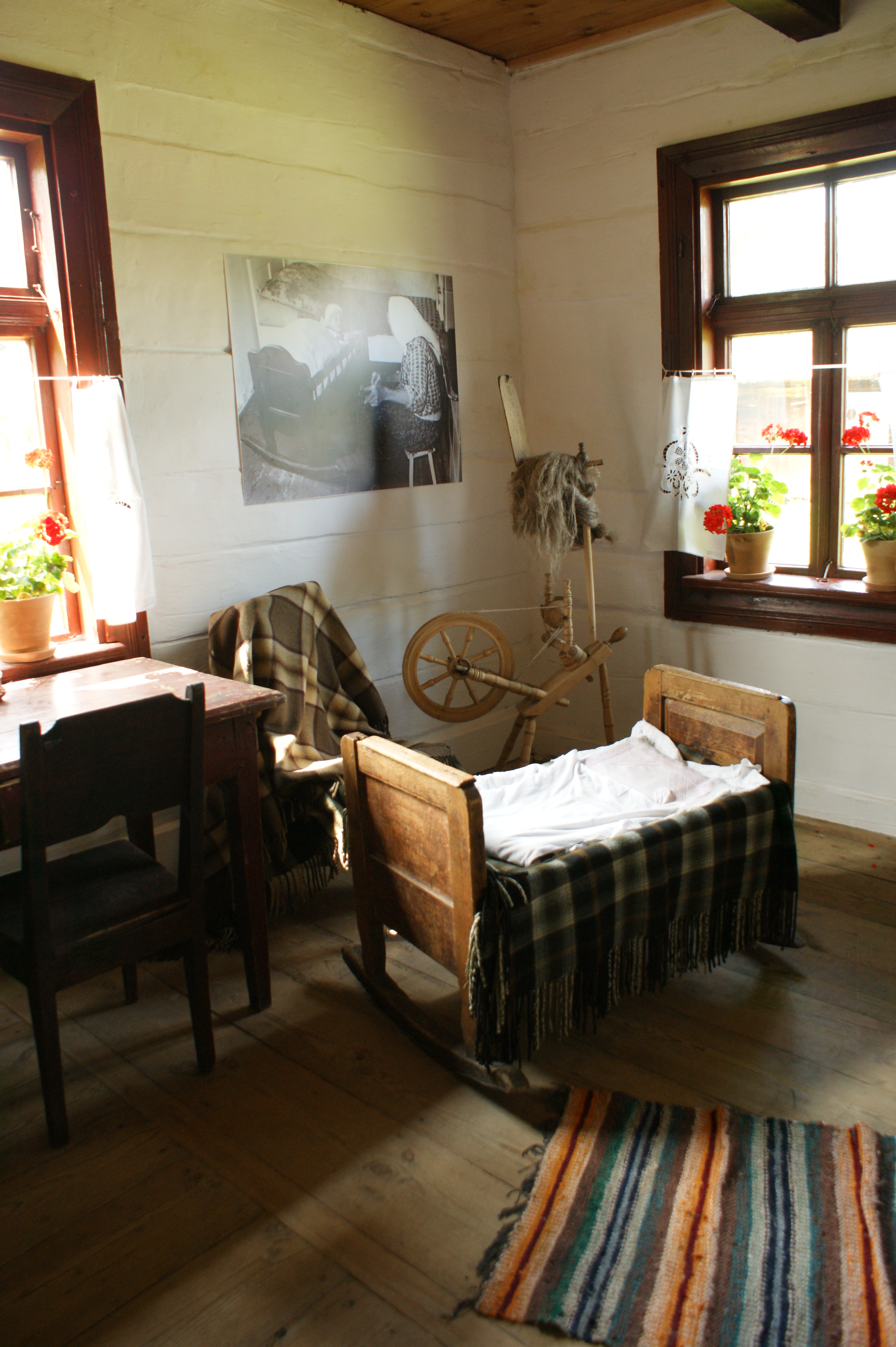 Wyposażenie chałupy wiejskiej: kołyska na biegunach oraz kołowrotek.