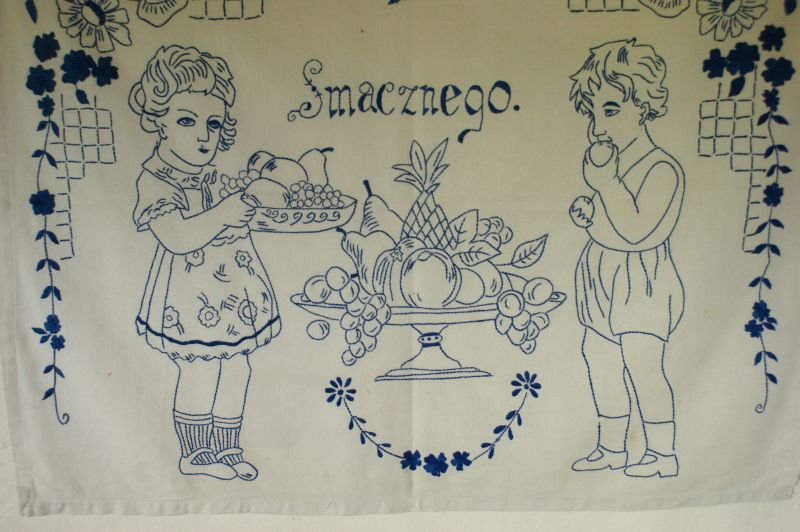 Wyszywana makatka, element wystroju wiejskiej chałupy.