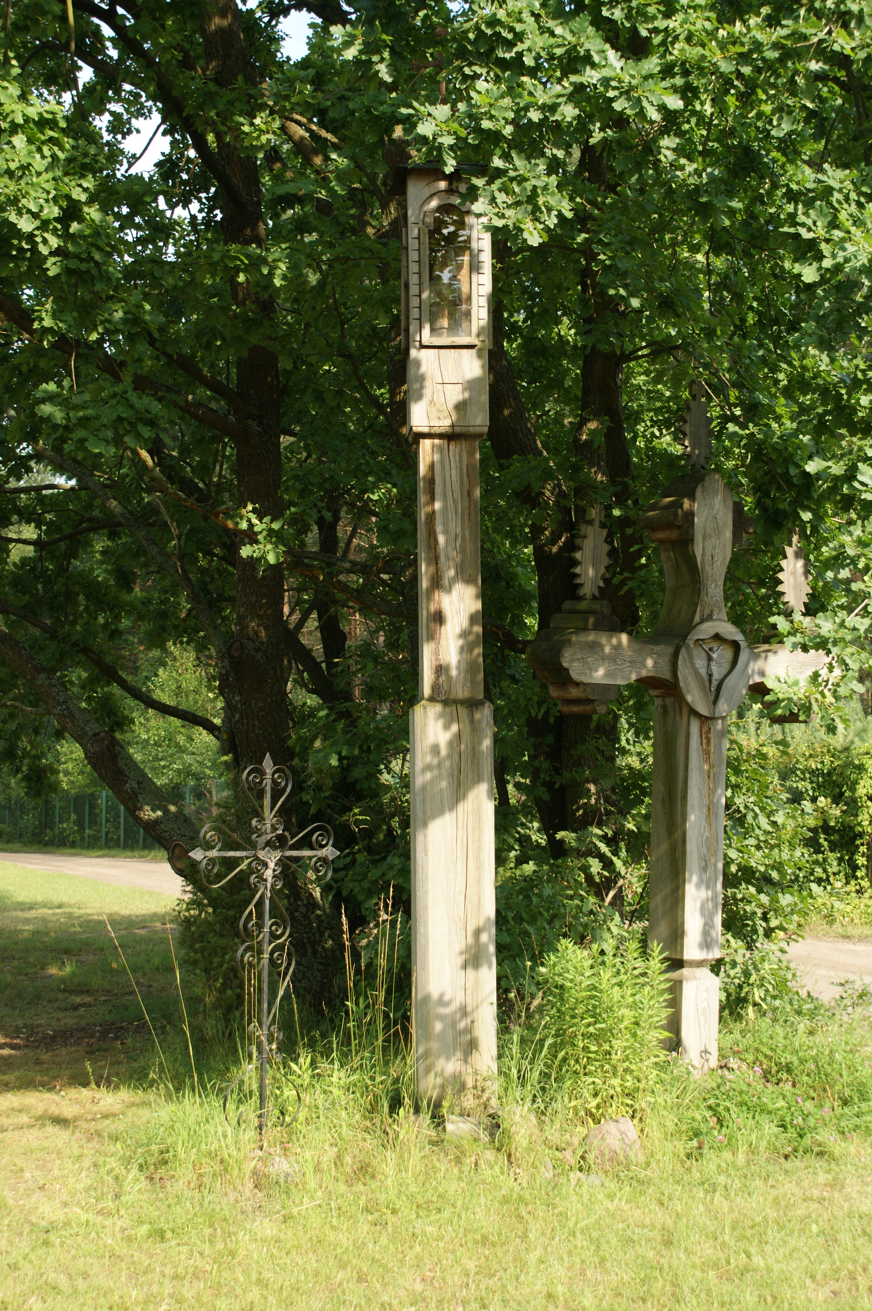 Drewniana, przydrożna kapliczka słupowa. Widoczne także: zdobiony krzyż drewniany oraz żelazny.