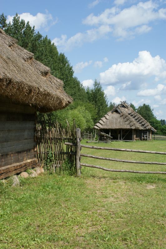 Stodoła ze wsi Nowy Ostrów z drewnianym kieratem ze wsi Suchowola. Widok od chałupy ze wsi Stara Grzybowszczyzna.
