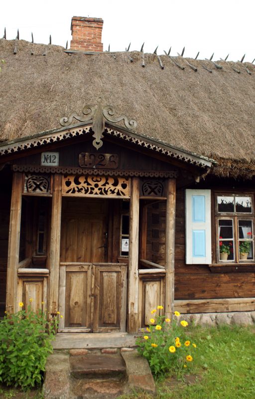 Ganek główny chałupy ze wsi Dąbrowa Moczydły z XIX wieku. Ganek ze zdobieniami stolarskimi. Fundament z kamienia uzupełnianego cementem. Budynek o konstrukcji zrębowej. dach kryty strzechą.
