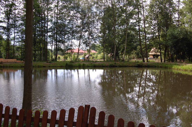 Przy wejściu na główny teren skansenu (kilka obiektów jest przy drodze głównej, po czym wewnętrzna droga prowadzi na teren, gdzie jest najwięcej obiektów, budynek administracyjny, kasa, parking) po obu stronach drogi są malownicze stawy.