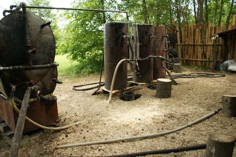 Leśna bimbrownia. Widoczne beczki na destylat i urządzenia do destylacji. Eksponat zarekwirowany i przekazany Muzeum przez policję.