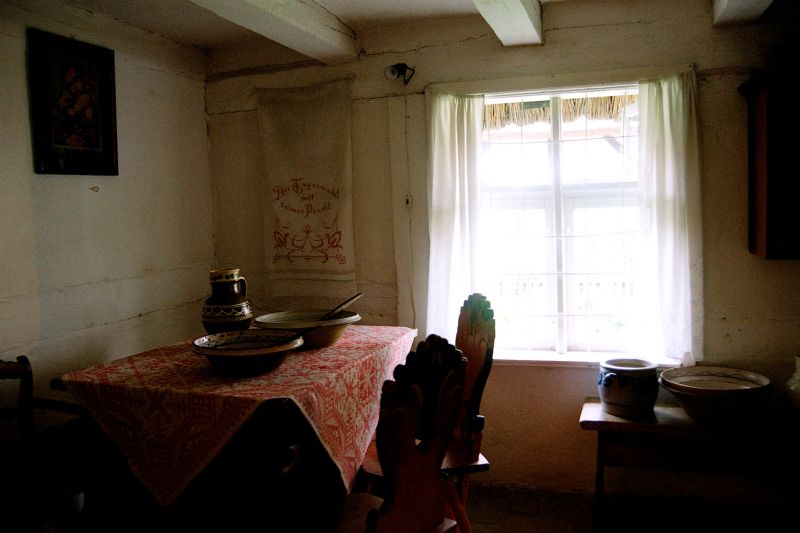 Wnętrze chałupy rybackiej ze wsi Dąbki pod Koszalinem z 1869 roku. Wyposażenie jamneńskie z przełomu XIX i XX wieku pochodzi ze wsi Jamno i Łobusz oraz innych wsi pomorskich.