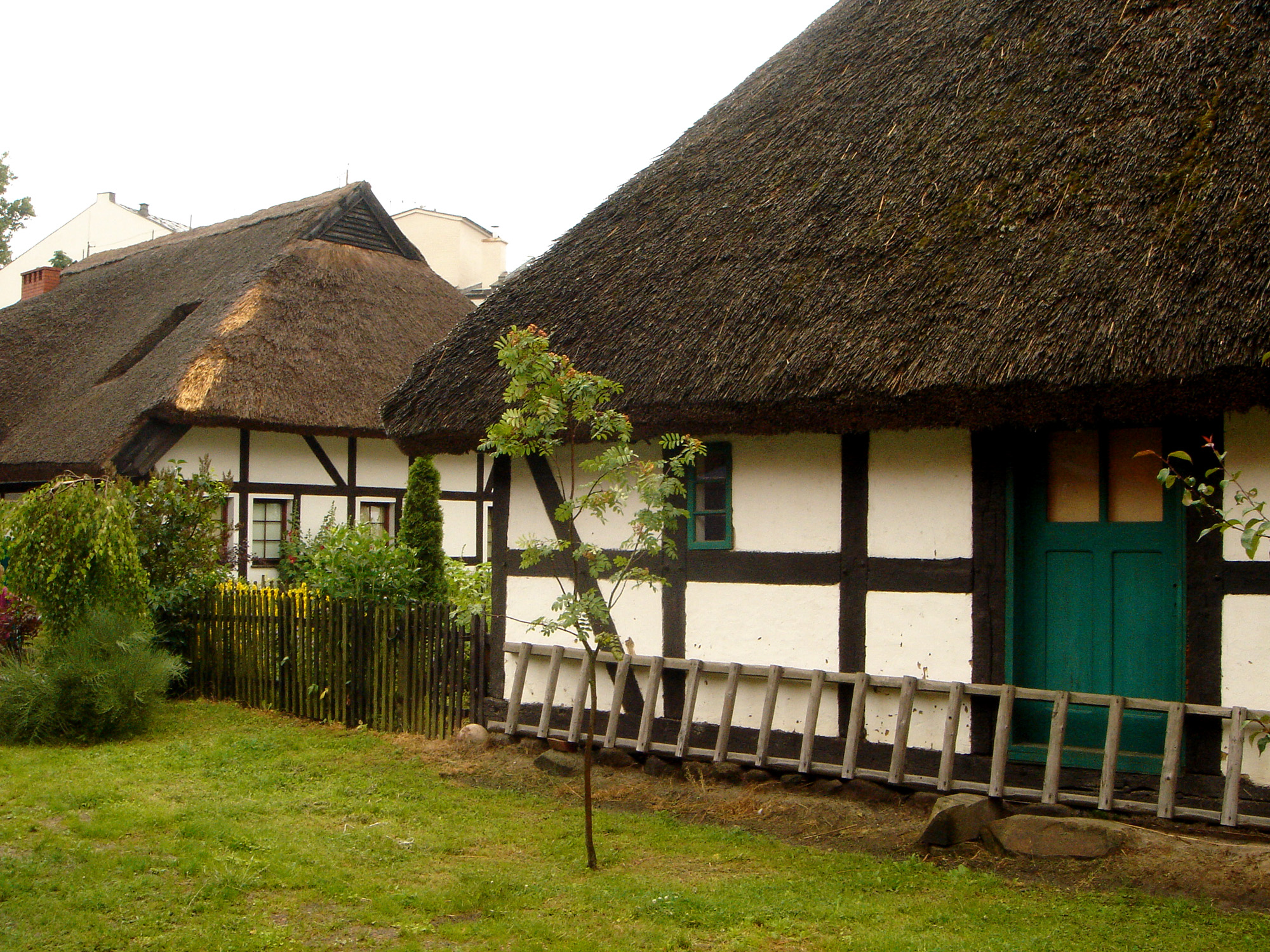 Zagroda rybacka z 1869 roku ze wsi Dąbki. Chałupa rybacka. Konstrukcja szkieletowa (ryglowa) wypełniona szachulcem (drewniane bale ułożone w kratownicę były wypełniane gliną zmieszaną z sieczką, trocinami czy wiórami, a następnie tynkowane). Dachy naczółkowe kryte trzciną.