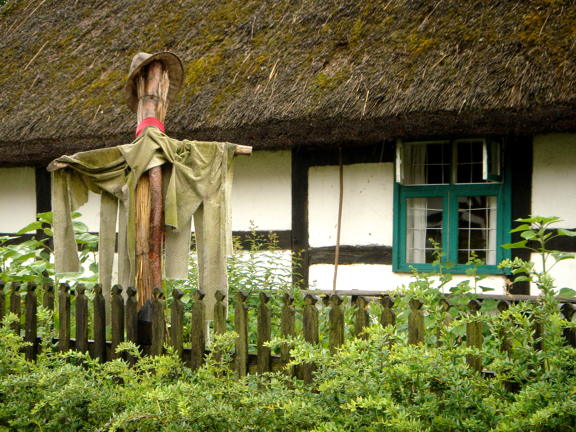 Zagroda rybacka z zewnątrz. Widoczne typowe budownictwo tego terenu – konstrukcje słupowo-ryglowe, tzw. szachulcowe. Przestrzenie pomiędzy konstrukcją słupową wypełniano pionowymi, drewnianymi dylami owiniętymi słomą i oblepiano mieszanką gliny z sieczką. Dach kryty trzciną.