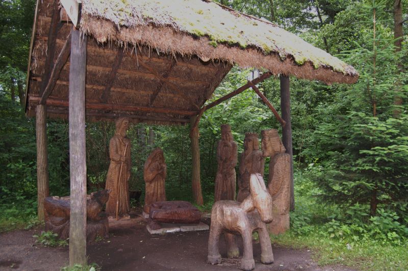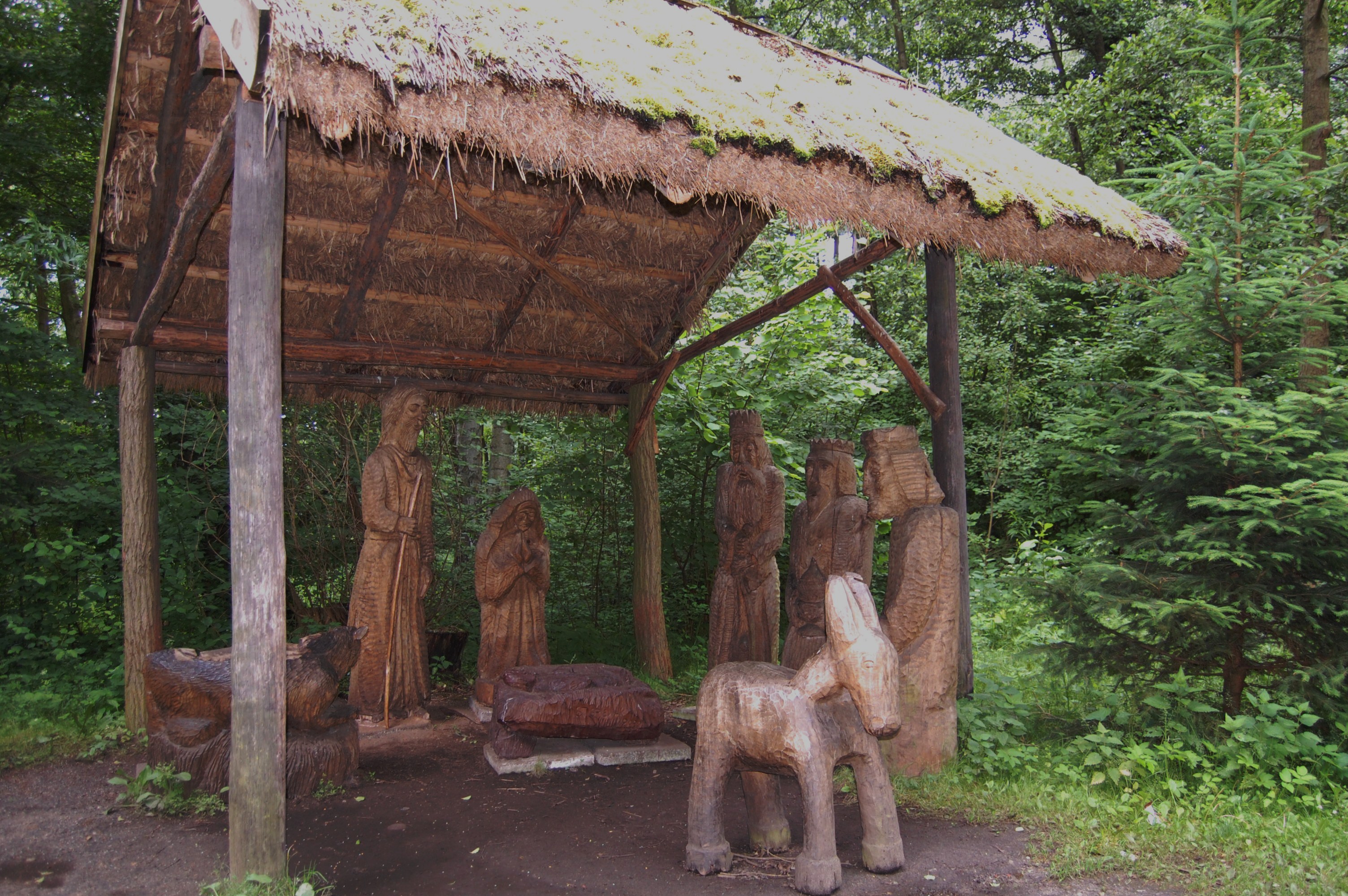 Zespół rzeźb "Boże Narodzenie", usytuowany na polanie nad stawem.