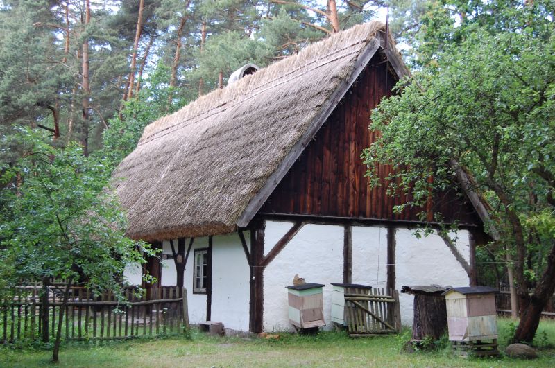 Widok na ścianę szczytową chałupy ze wsi Potrzebowo pochodzącej z 1675 roku. Widoczna część o konstrukcji szkieletowej powstała w XVIII wieku, na pierwszym planie drewniane ule. Dach dwuspadowy, krokwiowo-jętkowy pokryty strzechą.