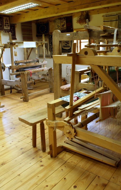 Pracownia tkacka wewnątrz chałupy ze wsi Woźnice. Na zdjęciu widoczne krosna i efekty pracy tkackiej (m.in. krajki, chodniki, sejpaki, tkaniny dwusosnowe i wielonicielnicowe)