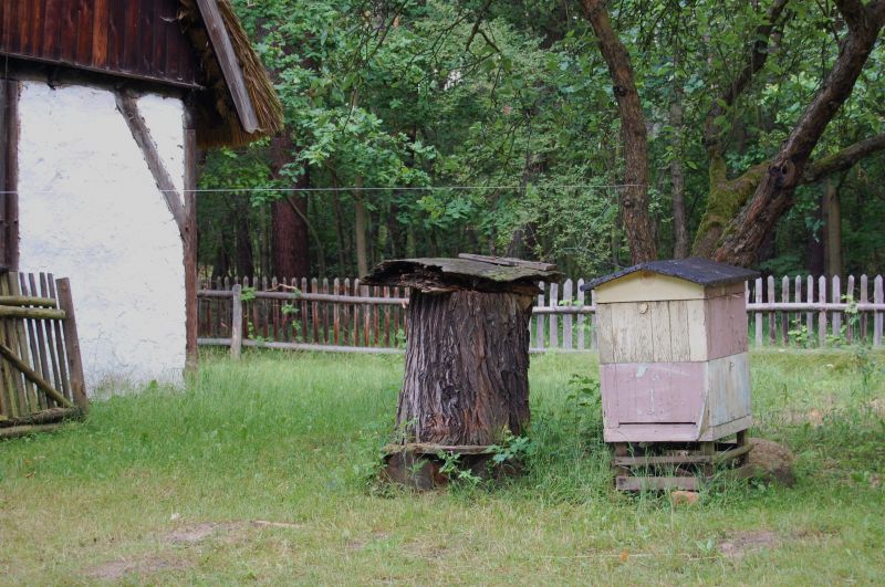 Zabytkowe drewniane ule na podwórku przy chałupie z Kargowej.