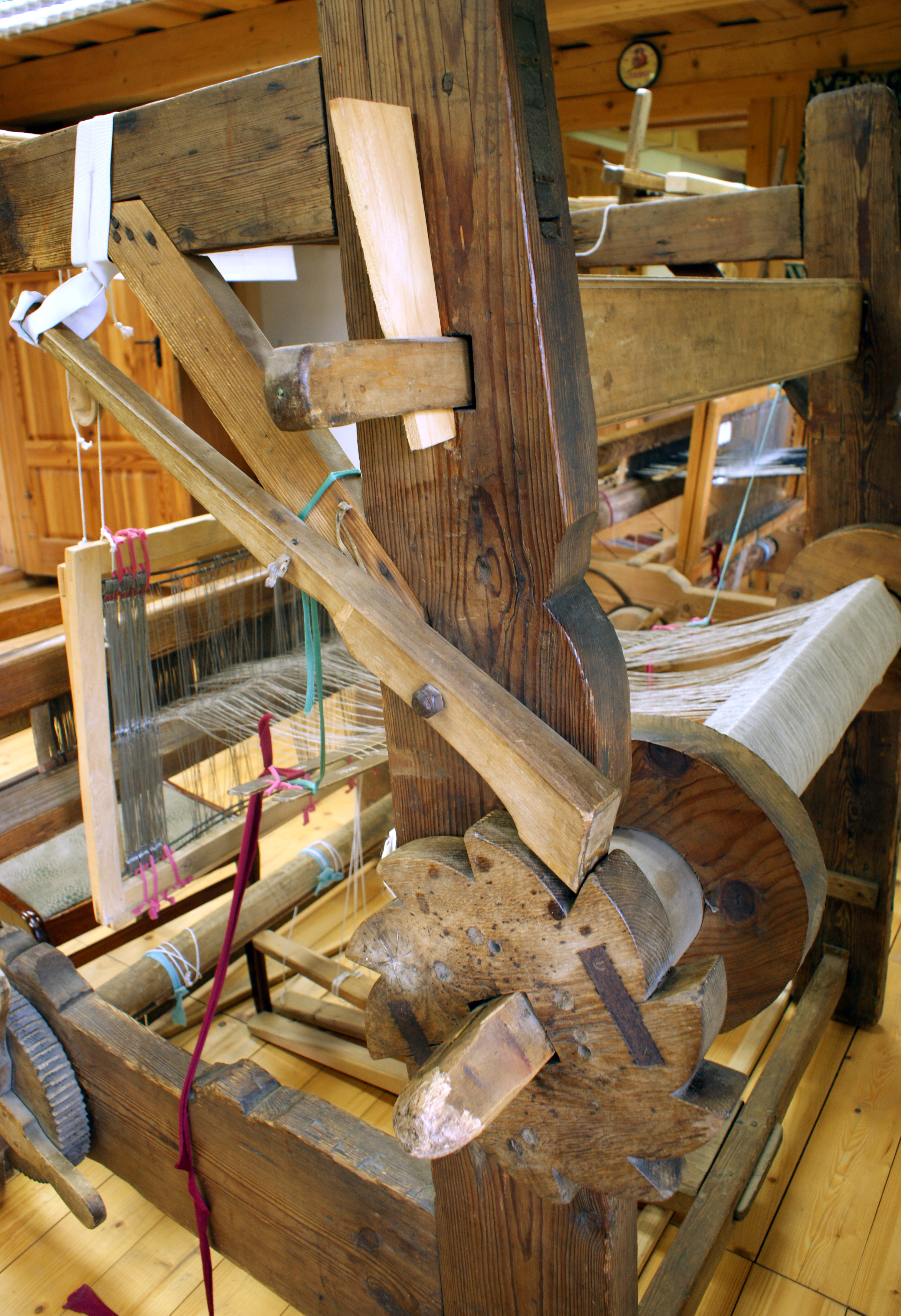 Pracownia tkacka wewnątrz chałupy ze wsi Woźnice. Na zdjęciu widoczne krosna.
