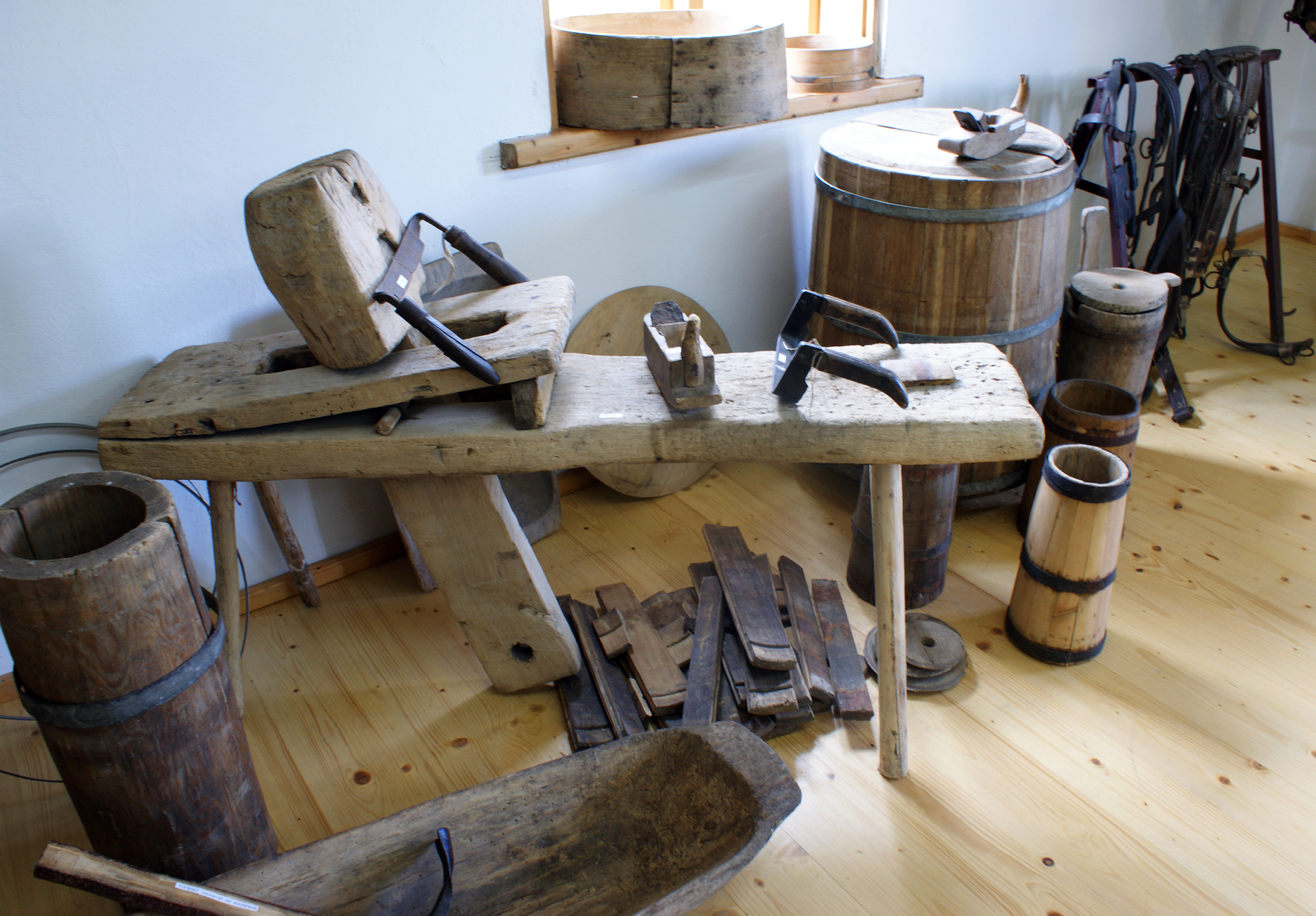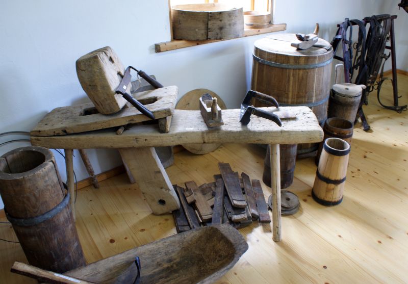 Sprzęty oraz produkty związane ze sztuką wikliniarską, ciesielską i kowalską na wystawie poświęconej rzemiosłu wiejskiemu w chałupie ze wsi Krzyżewo. Na zdjęciu stanowisko pracy cieśli.