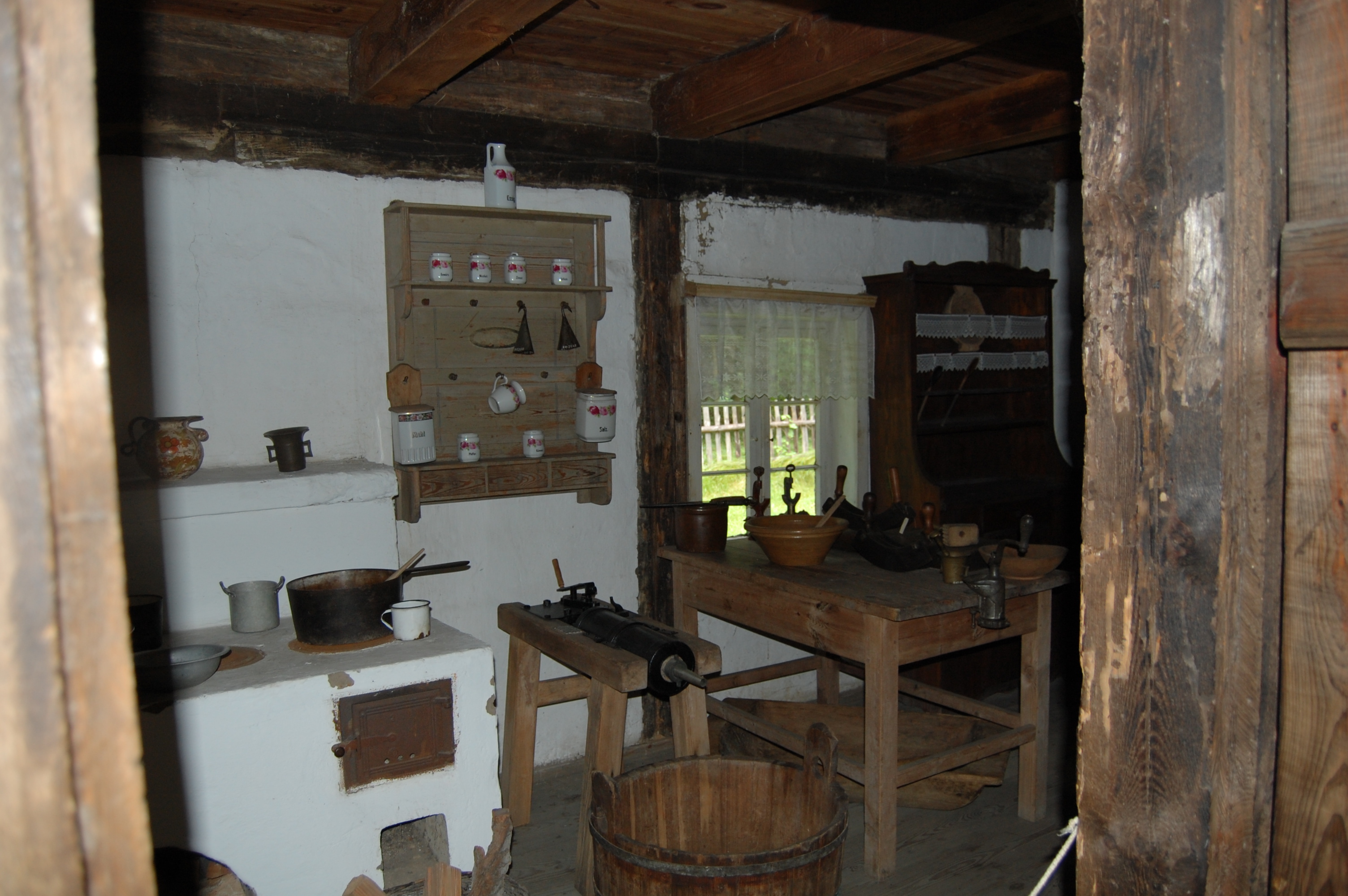 Widok kuchni w chałupie ze wsi Potrzebowo. Kuchnia mieści się w nowszej części budynku. Wyposażenie chałupy z początku XX wieku, z regionu Zachodniej Wielkopolski. Podłoga z desek.