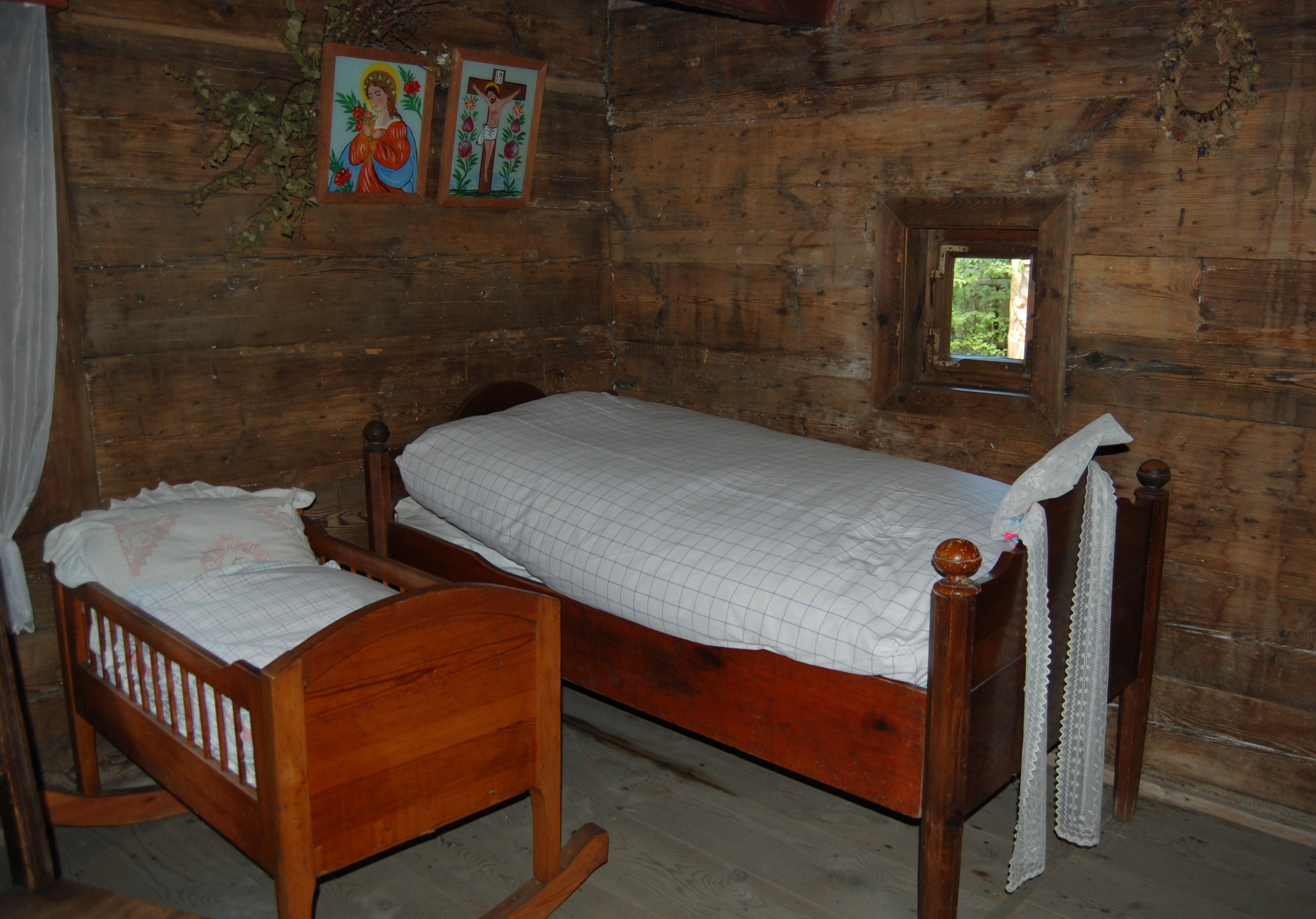 Widok na łóżko i drewnianą kołyskę na biegunach w głównej izbie chałupy ze wsi Potrzebowo.