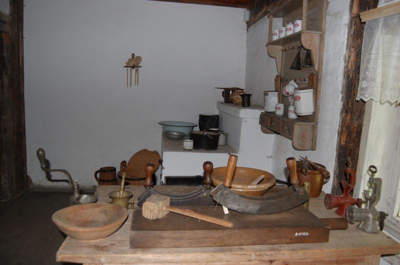 Kuchnia w chałupie ze wsi Potrzebowo, zbliżenie na stół i sprzęty kuchenne m.in. moździerze, makutry, młynek do mięsa.