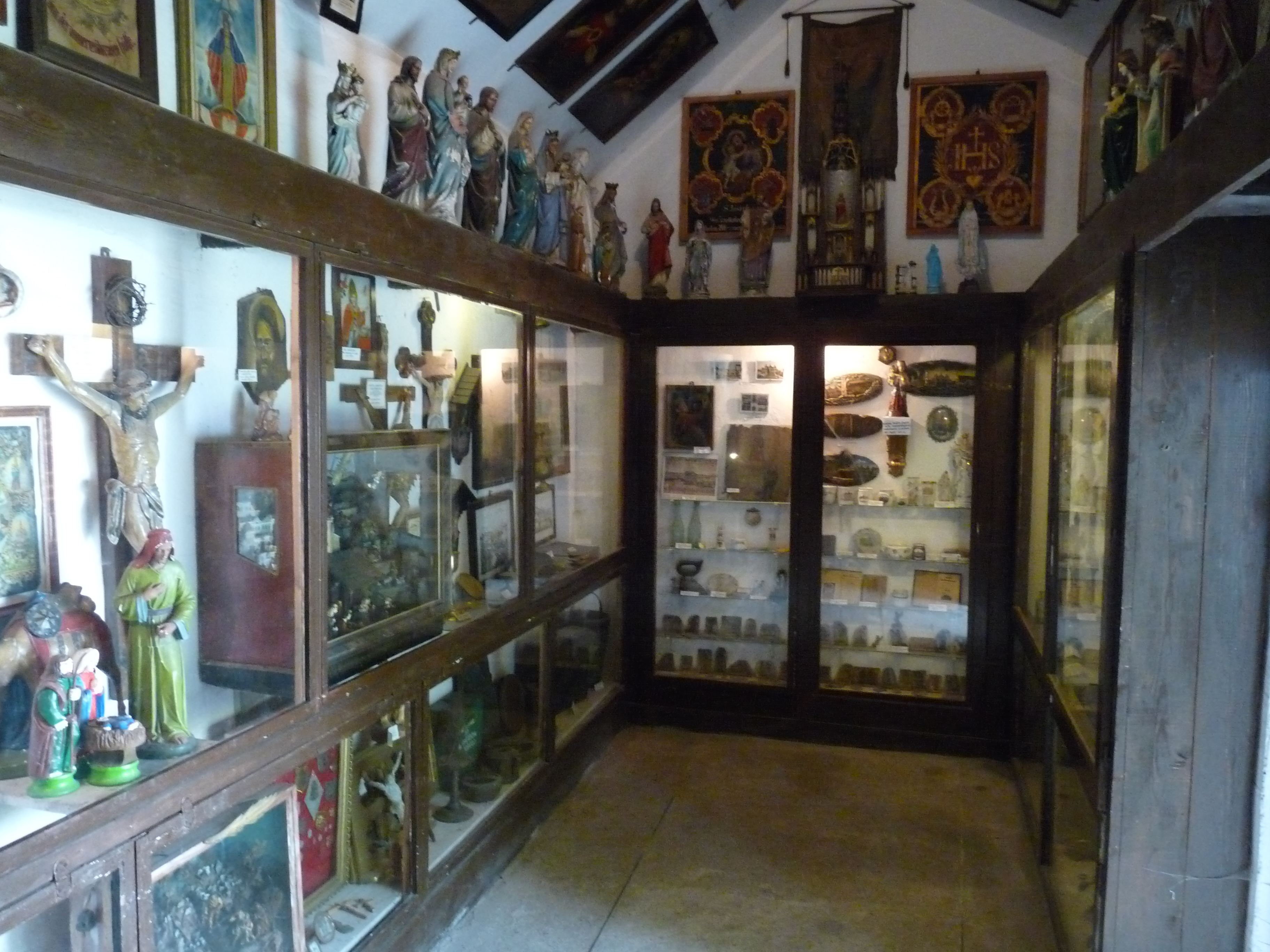 Pomieszczenie poświęcone religii: różnego typu obrazy o treści religijnej, polichromowane figury świętych, krucyfiksy, ołtarzyki, szopki.