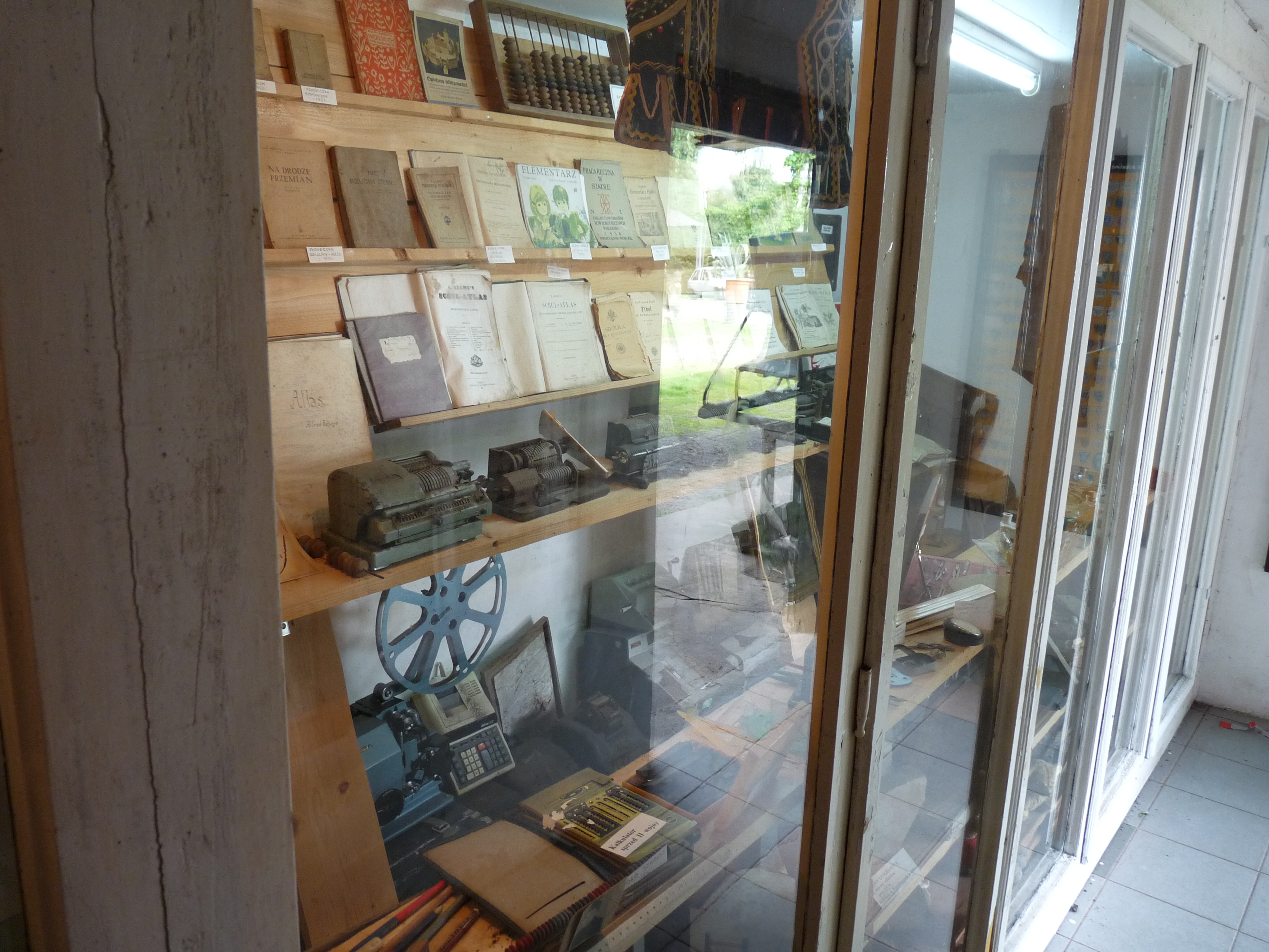 Gablota poświęcona edukacji. Podręczniki szkolne i różnego typu i z różnego okresy maszyny do pisania.