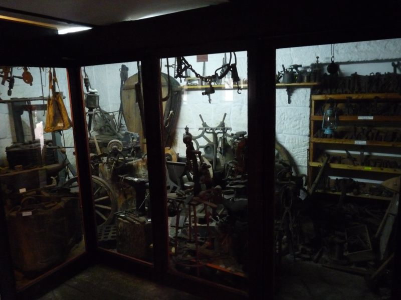 Wyposażenie kuźni: kowadła różnego typu, miechy kowalskie, wyroby kowalskie, kleszcze, młoty, drobne narzędzia kowalskie. Z tyłu widoczny stary miech austriacki z pocz. XIX w.