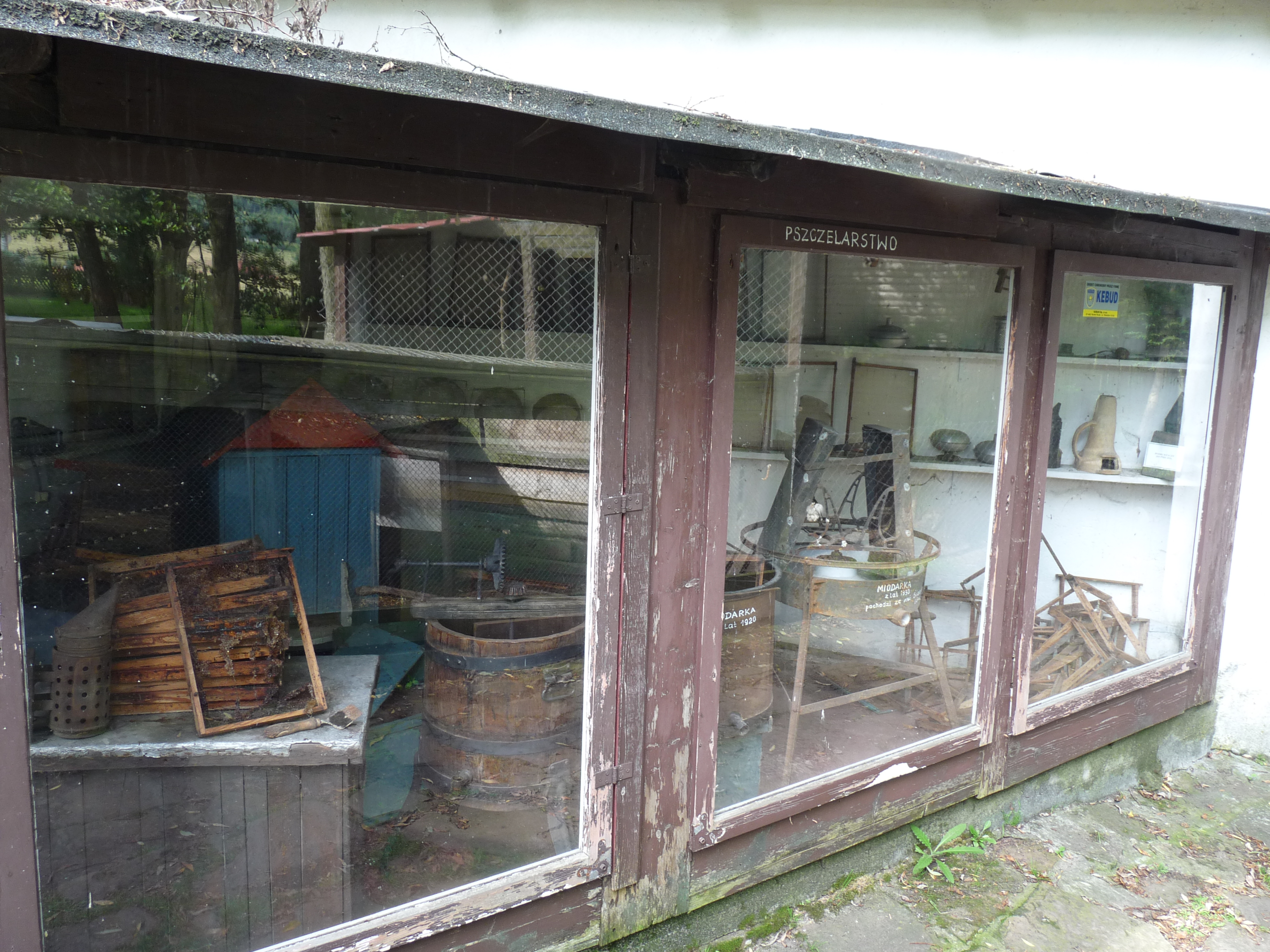 Gablota poświęcona pszczelarstwu i przetwarzaniu miodu. Na zdjęciu widoczne: ule skrzynkowe, ramki na plastry woskowe, woskowe plastry na miód, wirówka wydobywająca miód z plastrów.