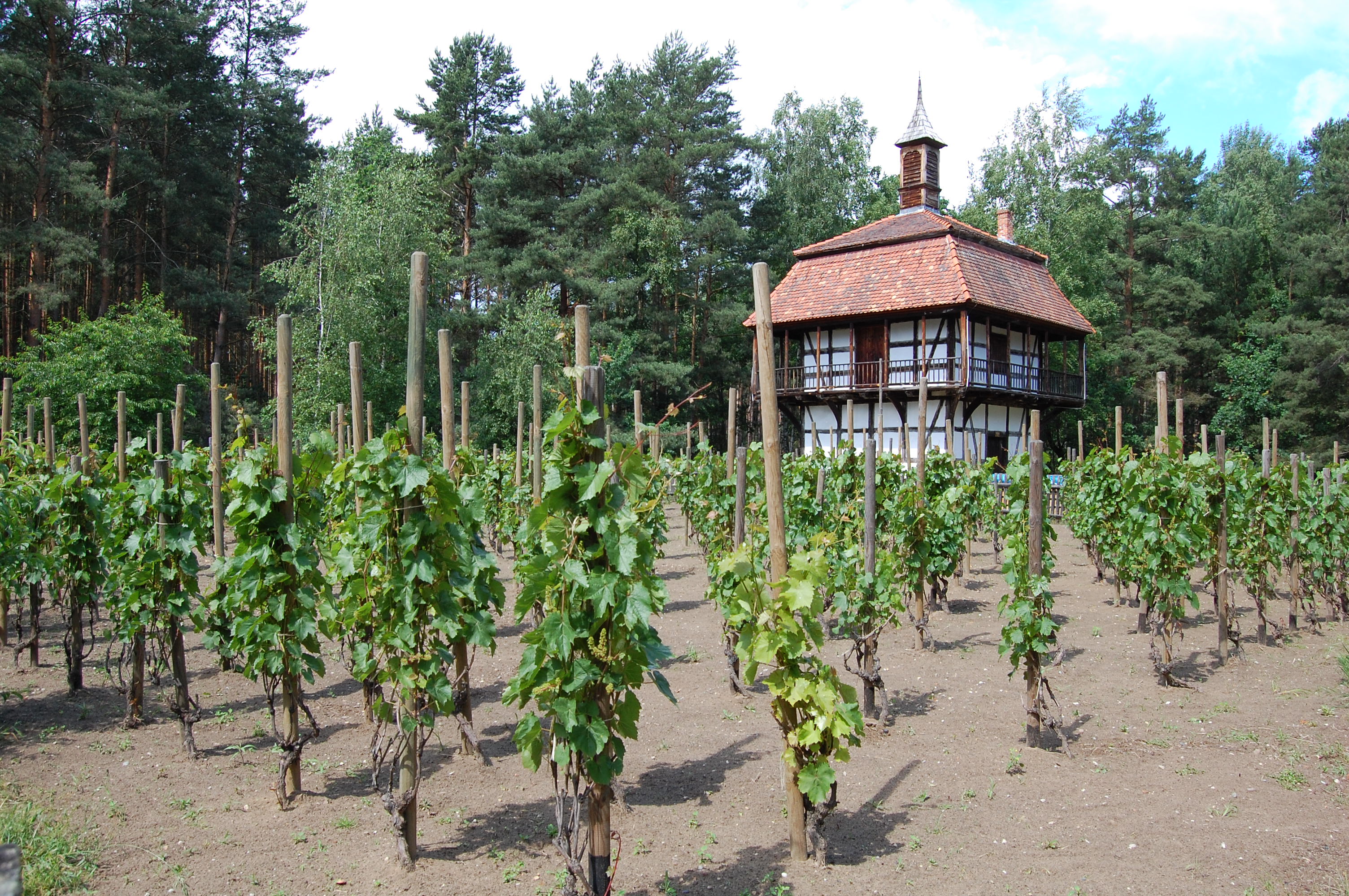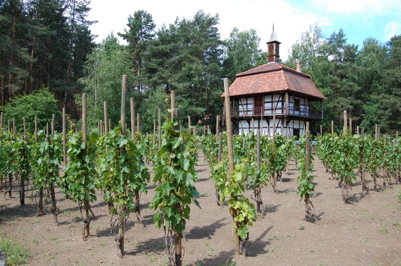 Widok na uprawę winorośli i XVIII wieżę winiarską ze wsi Budachów o konstrukcji szkieletowej.
