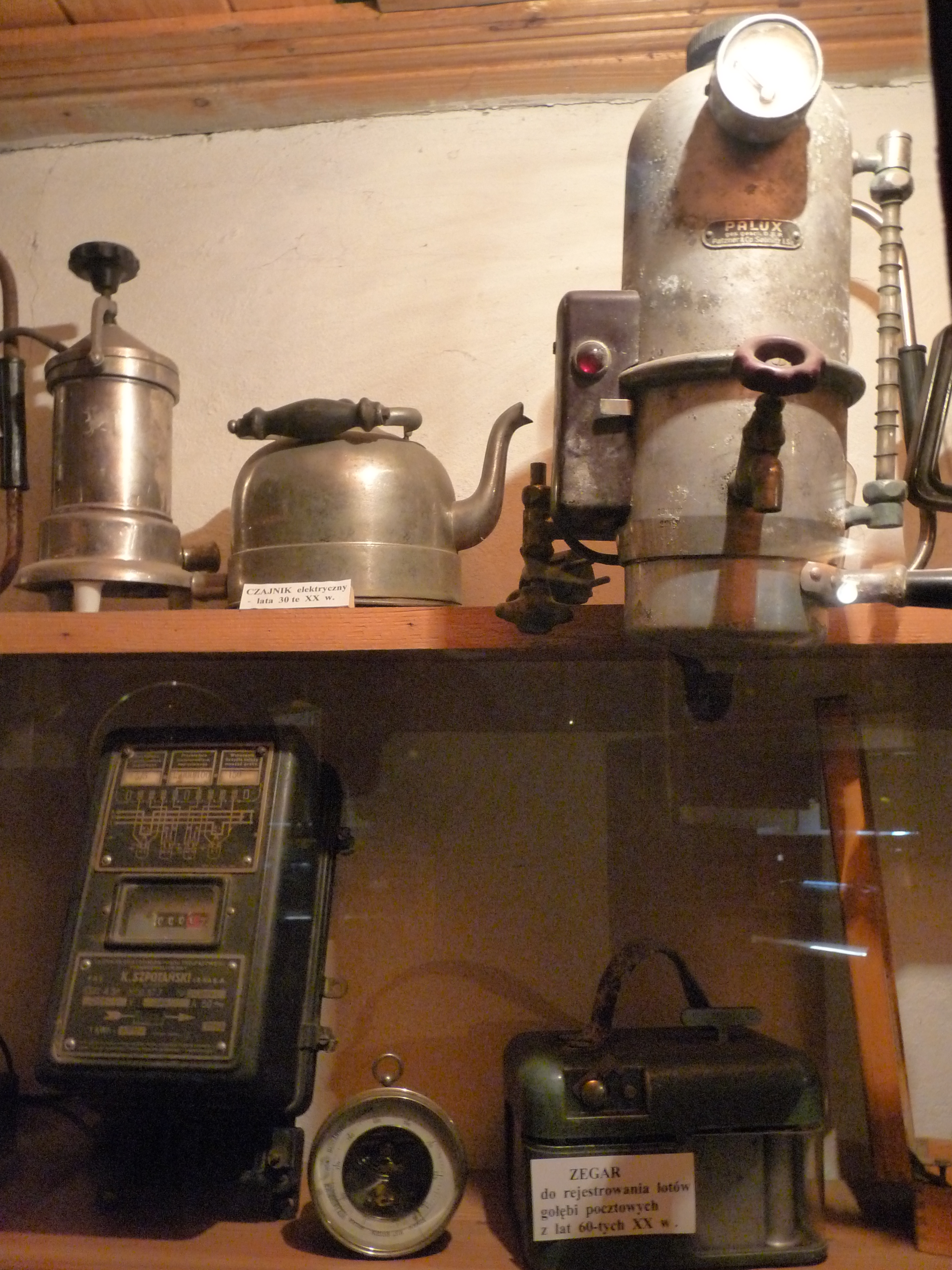 Na dole zegar do rejestrowania lotów gołebi pocztowych z lat 60-tych XX wieku.