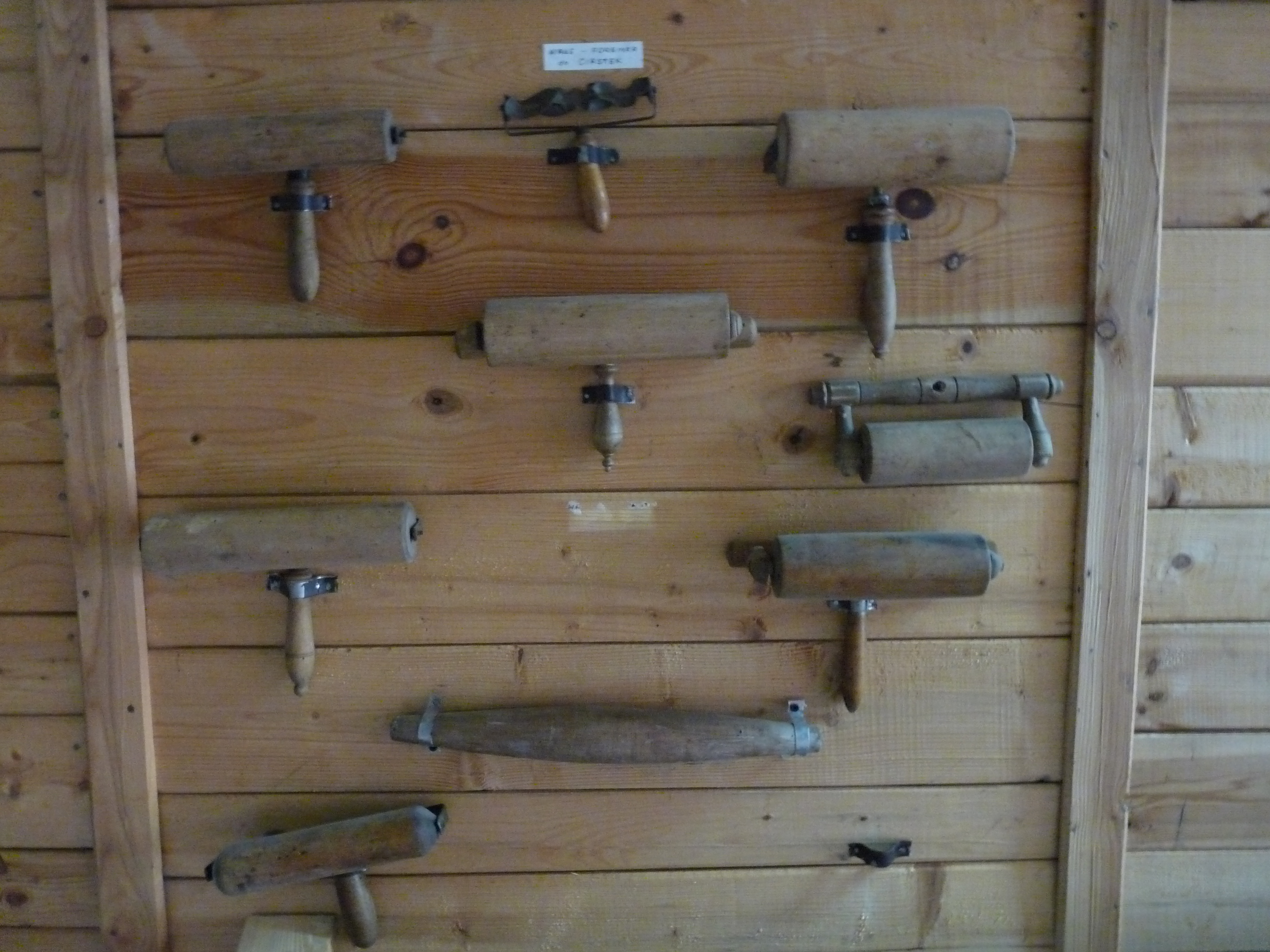 Drewniane wałki do ciasta z różnego okresu i metalowa wycinarka do ciastek.
