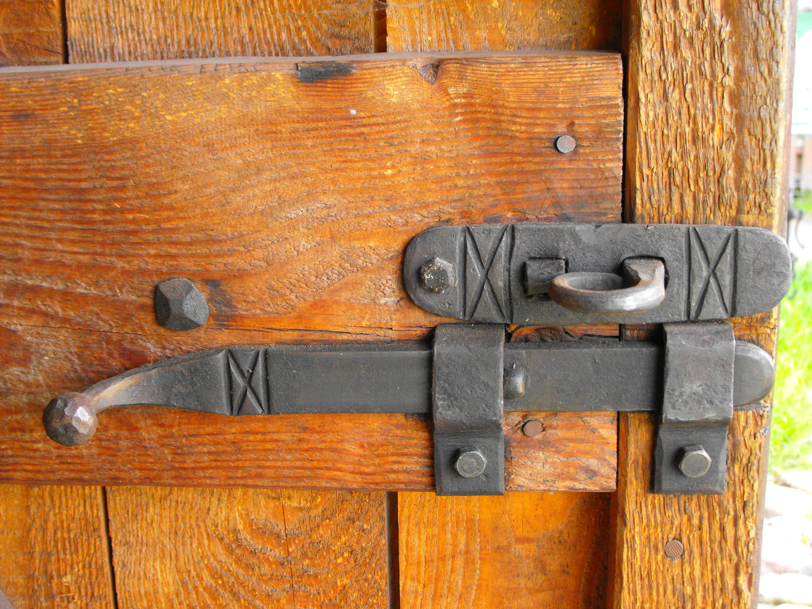 Drzwi do kuźni. Zdobiony żelazny rygiel, wykonany przez Zdzisława Gałeckiego.