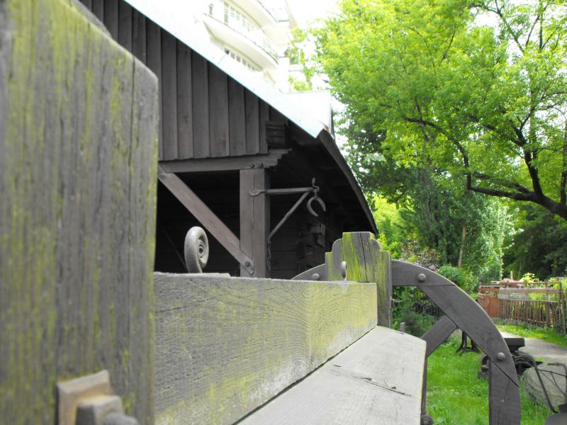 Widok znad belki kołowrotu studni na boczną ścianę kuźni.
