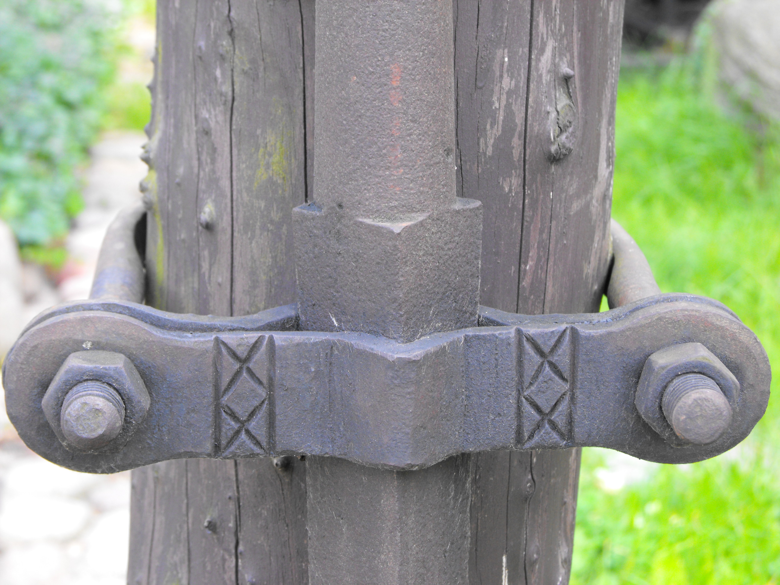 Ozdobny detal gwintownika: mocowanie pręta, na który nakręcano piastę do słupa wkopanego w ziemię. Gwintownik to urządzenie do wycinania gwintów wewnątrz piasty koła. Gotową piastę nakręcano na gwintownik dociskając ją dużą siłą do dołu. Gwint był wyżynany na zimno (tj. metal nie był rozgrzany) wewnątrz piasty. |