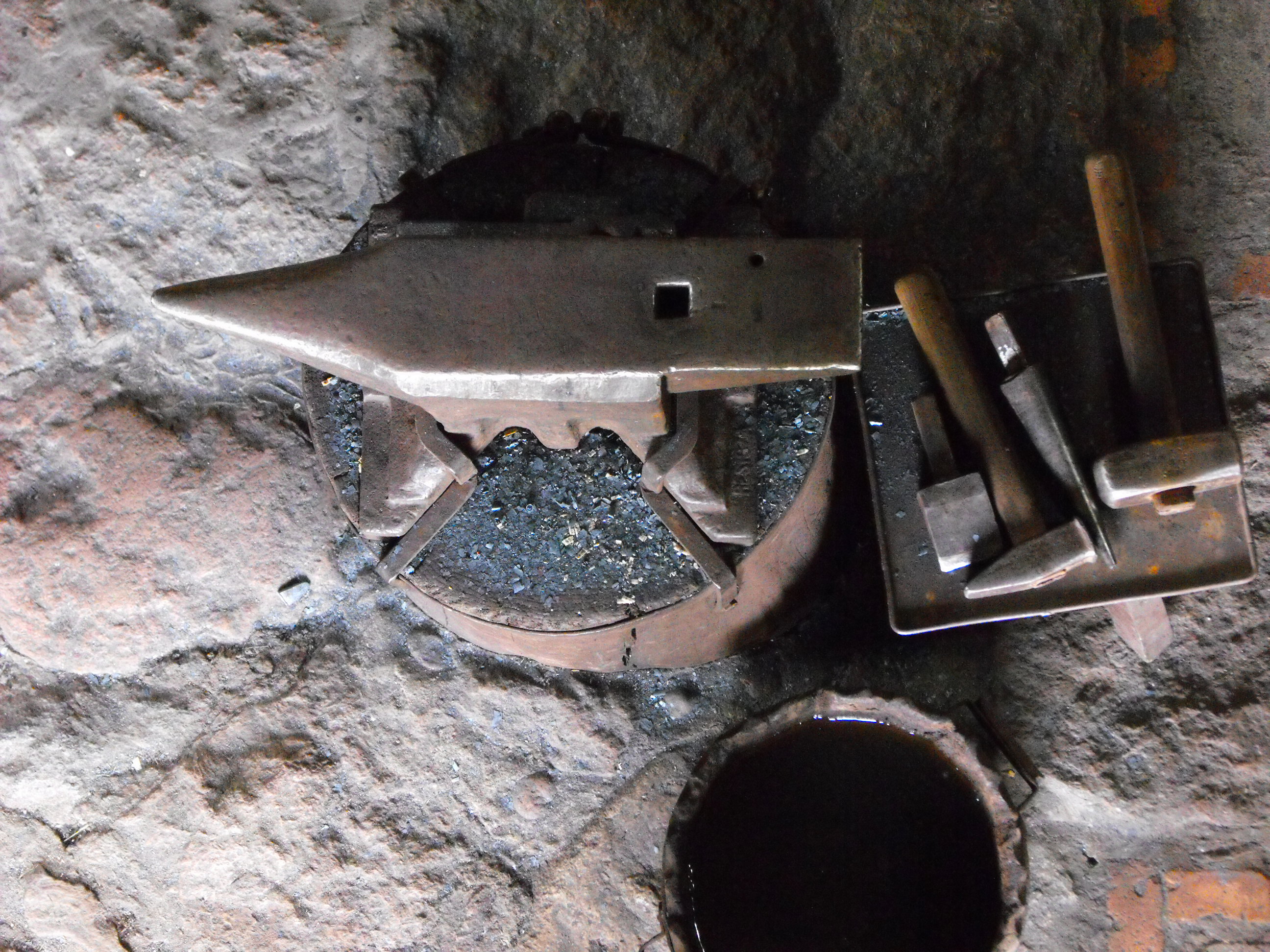 Wnętrze kuźni. Kowadło jednorożne (typ angielski), wiadro na wodę oraz narzędzia kowalskie. Podłoga kuźni jest kamienna, co zmniejsza ryzyko zaprószenia ognia.