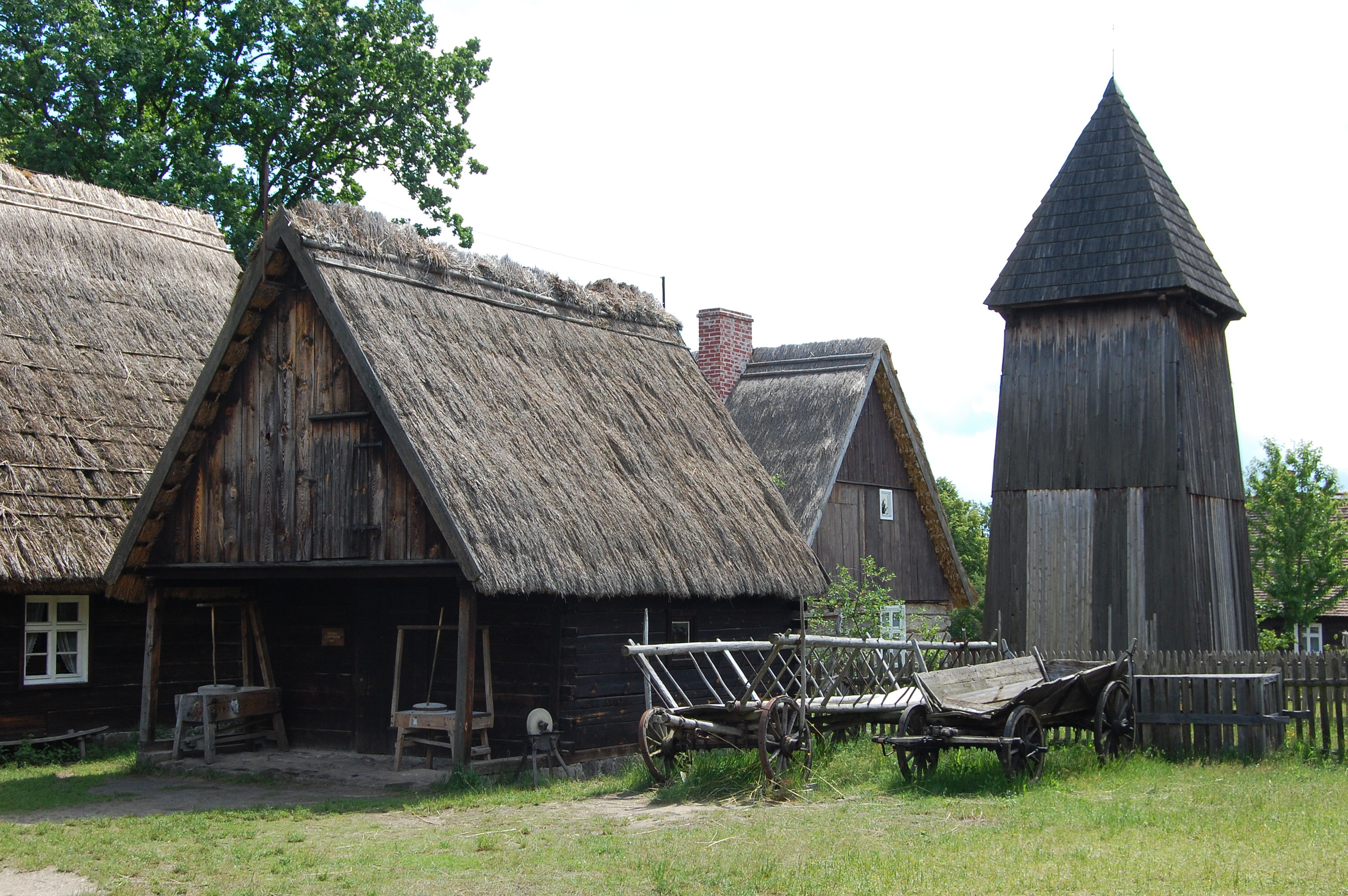 Widok na zagrodę bogatego gospodarza ze wsi Krobielewo (Zachodnia Wielkopolska). Na pierwszym planie rekonstrukcja podcieniowego spichlerza z 1823 roku. Dach spichlerza - jak i innych budynków w zagrodzie - jest dwuspadowy krokwiowo - jętkowy, kryty słomianą strzechą. Jest to budynek o konstrukcji zrębowej z występującymi na węgłach "ostatkami na rybi ogon". Za nim widać usytuowaną blisko dzwonnicę z Drzonkowa. |