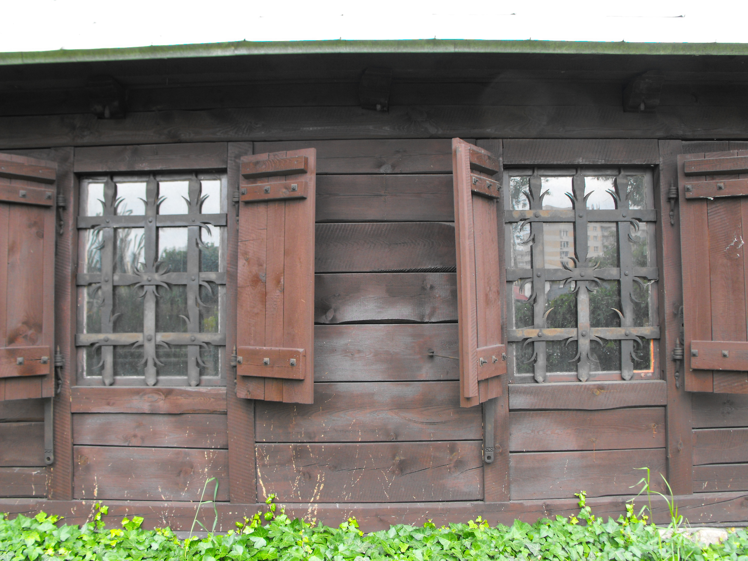 Okna kuźni z okiennicami i kutymi kratami. Elementy kute wykonane przez Zdzisława Gałeckiego.