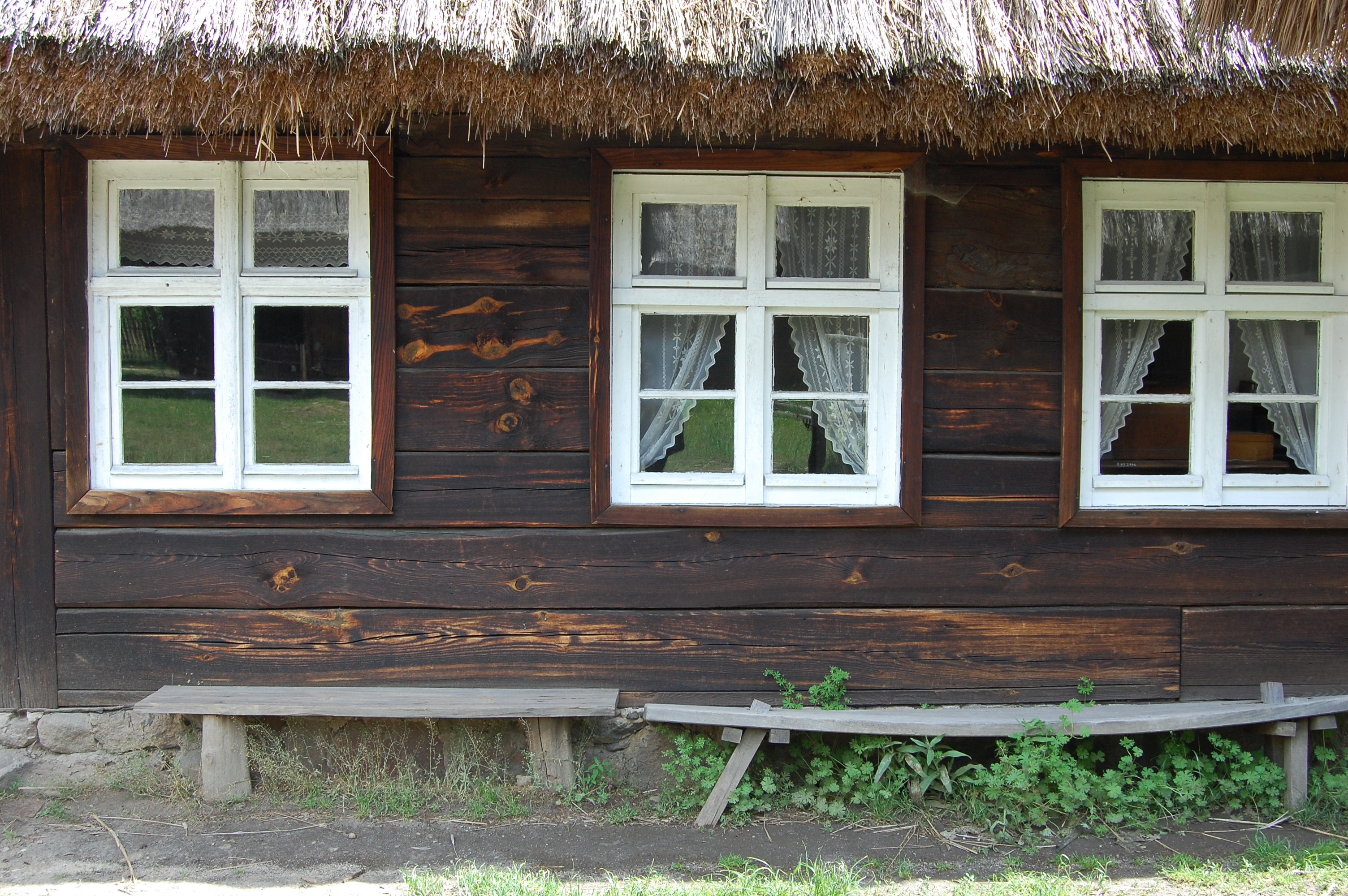 Okna chałupy bogatego gospodarstwa ze wsi Krobielowo (Zachodnia Wielkopolska) pochodzącej z 1803 roku. Widok od podwórka.