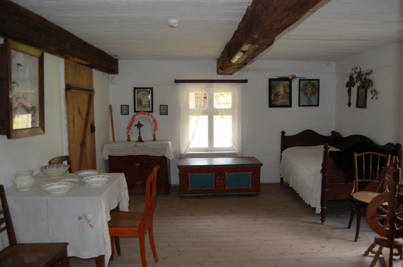 Widok na izbę w części dziadków – „dożywotników” w chałupie bogatego gospodarza ze wsi Krobielewo. Sprzęty z lat 30tych XX wieku, zarówno produkcji własnej, rzemieślniczej, jak i przemysłowej, należące do ludności autochtonicznej.
