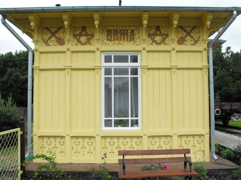 Ściana boczna stacyjki Wolbórka (później Czarnocin). Budynek drewniany o konstrukcji słupowo-ryglowej wypełnionej deskami. Przed wejściem ganek wsparty na czterech kolumnach. Liczne, ażurowe elementy dekoracyjne ścian i obudowy ganku. Stacyjka reprezentuje tzw. styl uzdrowiskowy, który rozpowszechnił się w całej Europie po wystawach paryskich z lat 80. XIX w. Cechuje go lekkość konstrukcji i bogata, drewniana ornamentyka. Z ustaleń znawców dawnej architektury wynika, że takie właśnie, identyczne stacyjki, budowane systemem modułowym w warszawskich warsztatach kolejowych, ustawiono wzdłuż dawnej Kolei Warszawsko - Wiedeńskiej. Obecnie znajduje się w niej biuro Skansenu. |