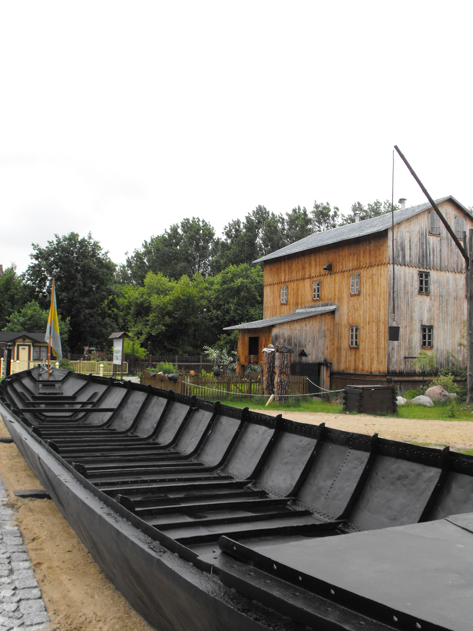 Widok na teren Skansenu. Na pierwszym planie barka rzeczna typu „Szczupak” z 1907 roku ze stoczni A. Wojan w Gdańsku. Łódź została skonstruowana ze stalowych blach łączonych nitami. Jej długość wynosi 17 metrów, a szerokość 2,7 metra.