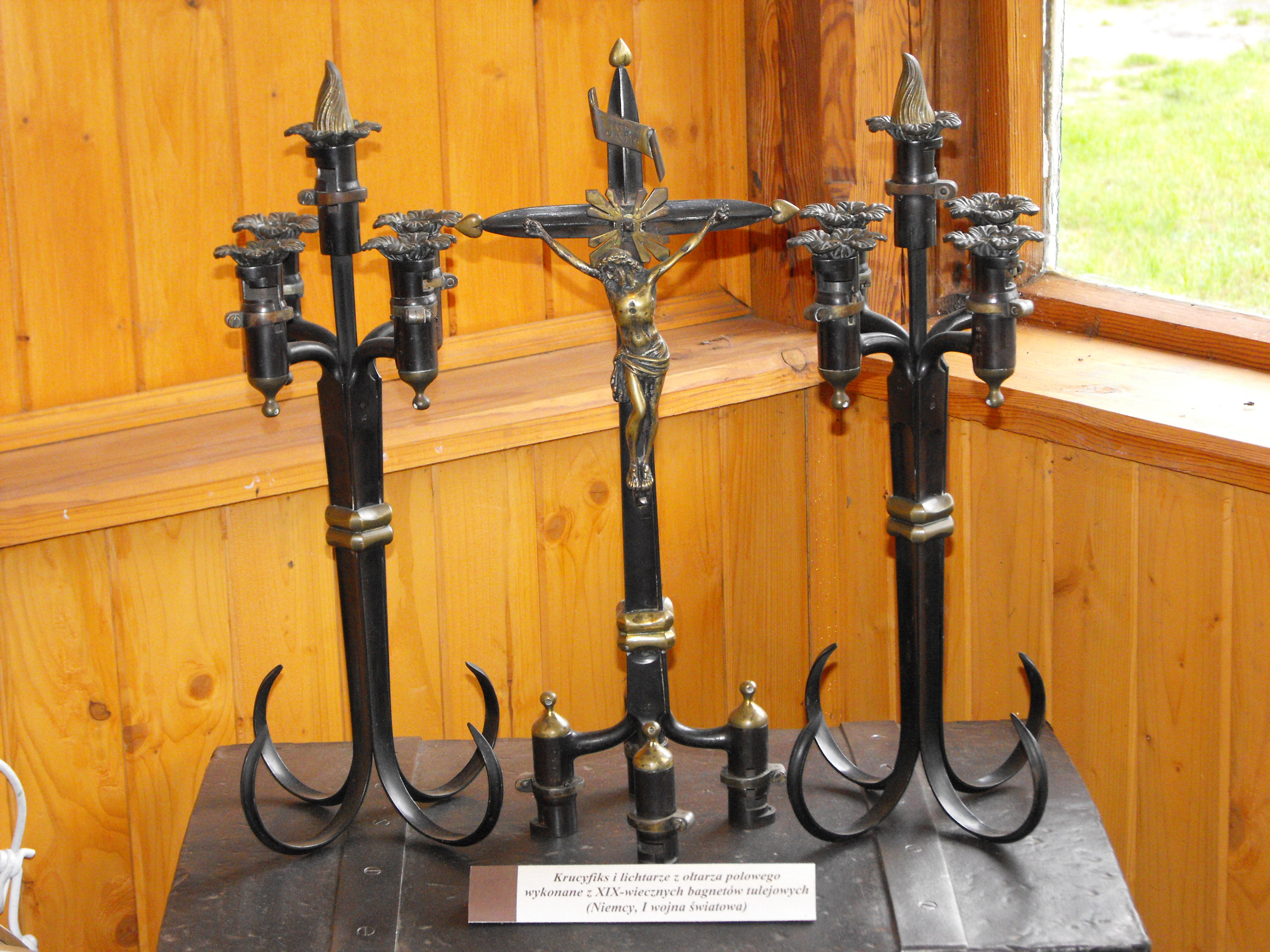 Sztuka okopowa. Krucyfiks i lichtarze zbudowane z bagnetów tulejowych.