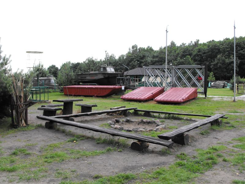 Miejsce na ognisko. W tle widoczne kuter holowniczy i most pontonowy.