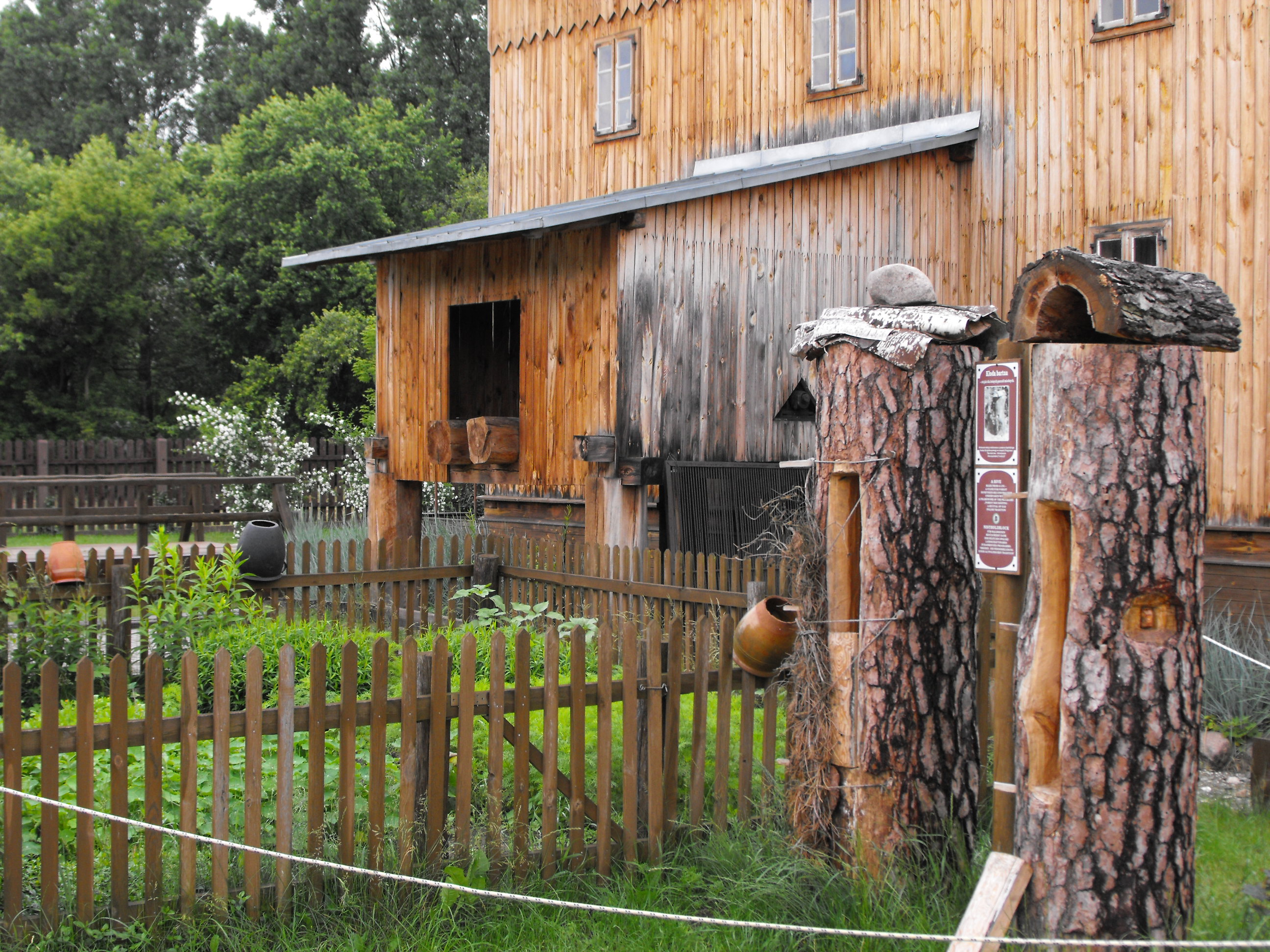 Kłody bartne z wyciętymi otworami pod barcie. W tle widoczny młyn wodny.