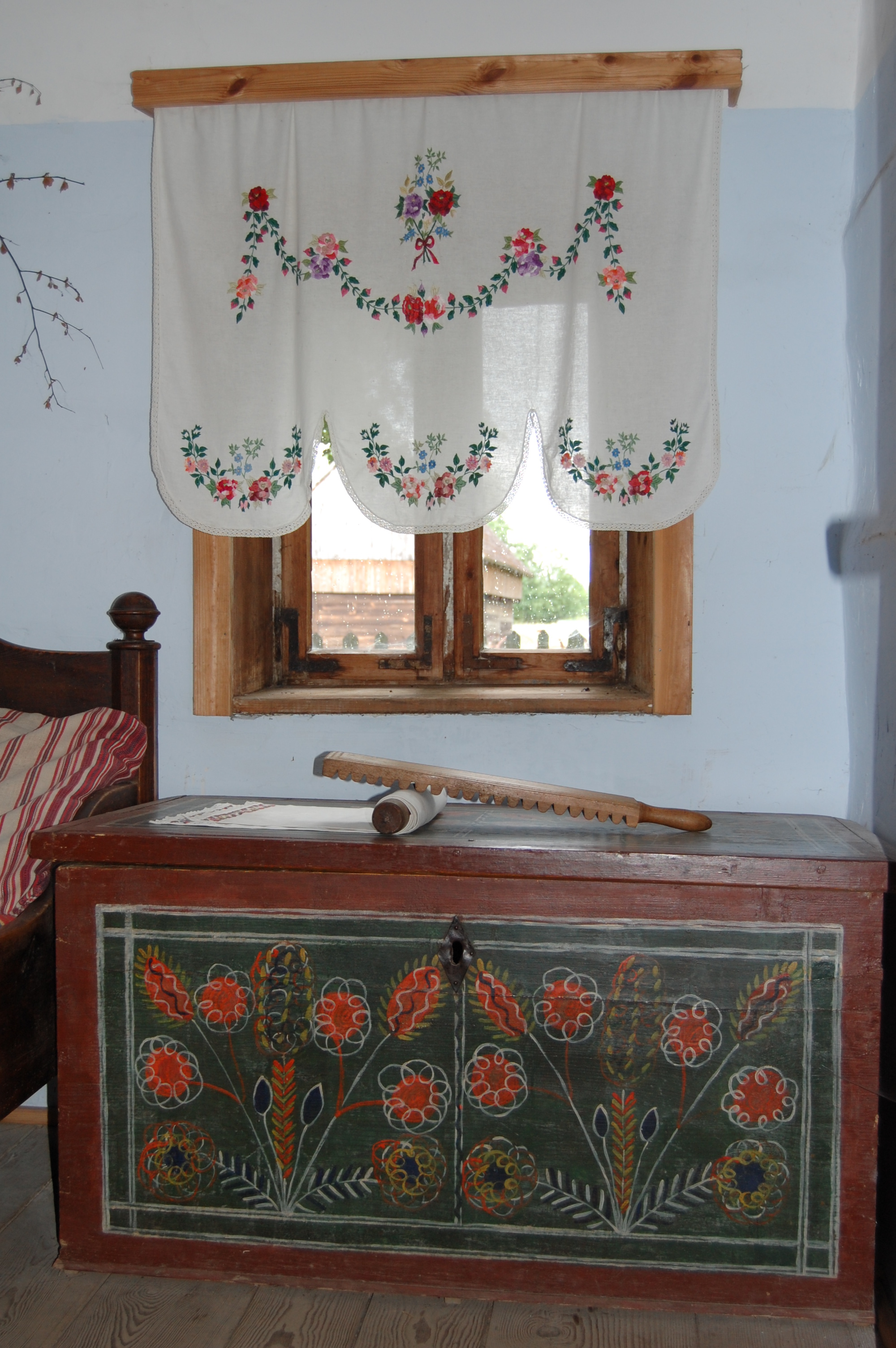 Wnętrze chałupy ze wsi Jurzyn, pochodzącej z przełomu XVIII i XIX wieku. Izba główna. Na zdjęciu widoczny detal: malowana skrzynia, wałek do maglowania ręcznego i okno z ozdobną zasłonką typową dla kultury ludności przesiedlonej z województwa tarnopolskiego.
