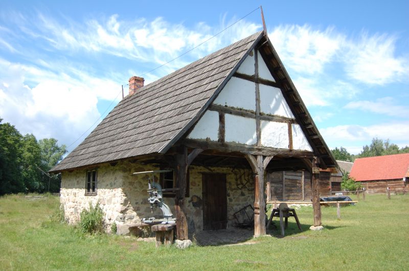 XVIII-wieczna kuźnia, pochodząca ze wsi Kosieczyn (Zachodnia Wielkopolska). Kuźnia zbudowana jest z kamienia polnego na zaprawie wapiennej. Przed wejściem znajduje się wysunięty podcień wsparty na trzech profilowanych słupach z zastrzałami. Ściana szczytowa wysunięta na około 2 metry przed lico frontu wypełniona jest szachulcem. Na ścianach z kamieni ułożone są belki zwane murłatami, na których opiera się krokwiowo - jętkowa konstrukcja dachu. Dwuspadowy dach pokryty został gontem. |