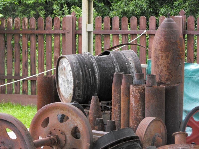 Sprzęty wojenne. Część zbiorów "wojennych trofeów Pilicy". Cysterna (WEHRMACHT 1943) i łuski po pociskach.