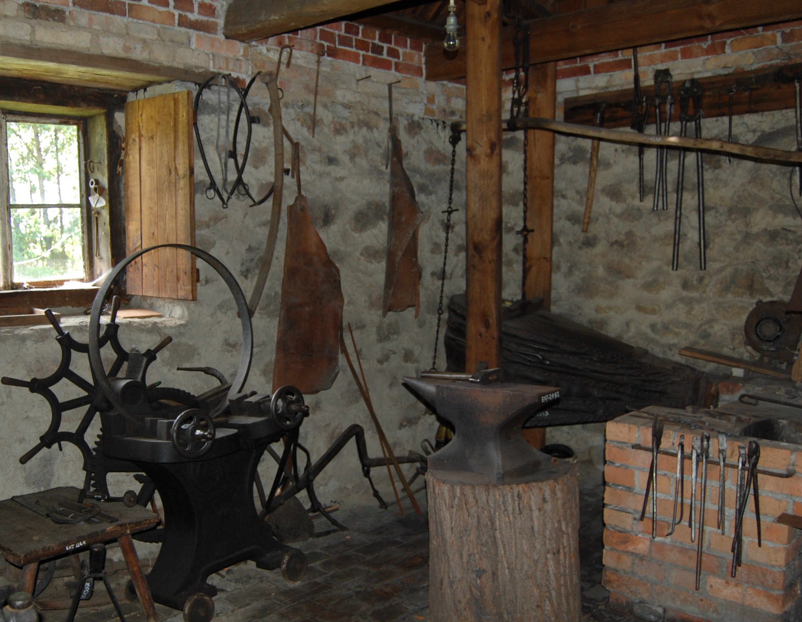 Wnętrze XVIII-wiecznej kuźni ze wsi Kosieczyn. Piec z palonej cegły z dwoma paleniskami oraz sprzęty i narzędzia kowalskie (kowadła, imadła, giętarka, wiertarka, spęczarka oraz szereg kleszczy, kształtowników, młotków i innych drobnych narzędzi). Do paleniska podłączone są dwa miechy (za zdjęciu widać tylko jeden z nich). Narzędzia w większości pochodzą z Kosieczyna i okolic. Posadzka wykonana z cegły. |