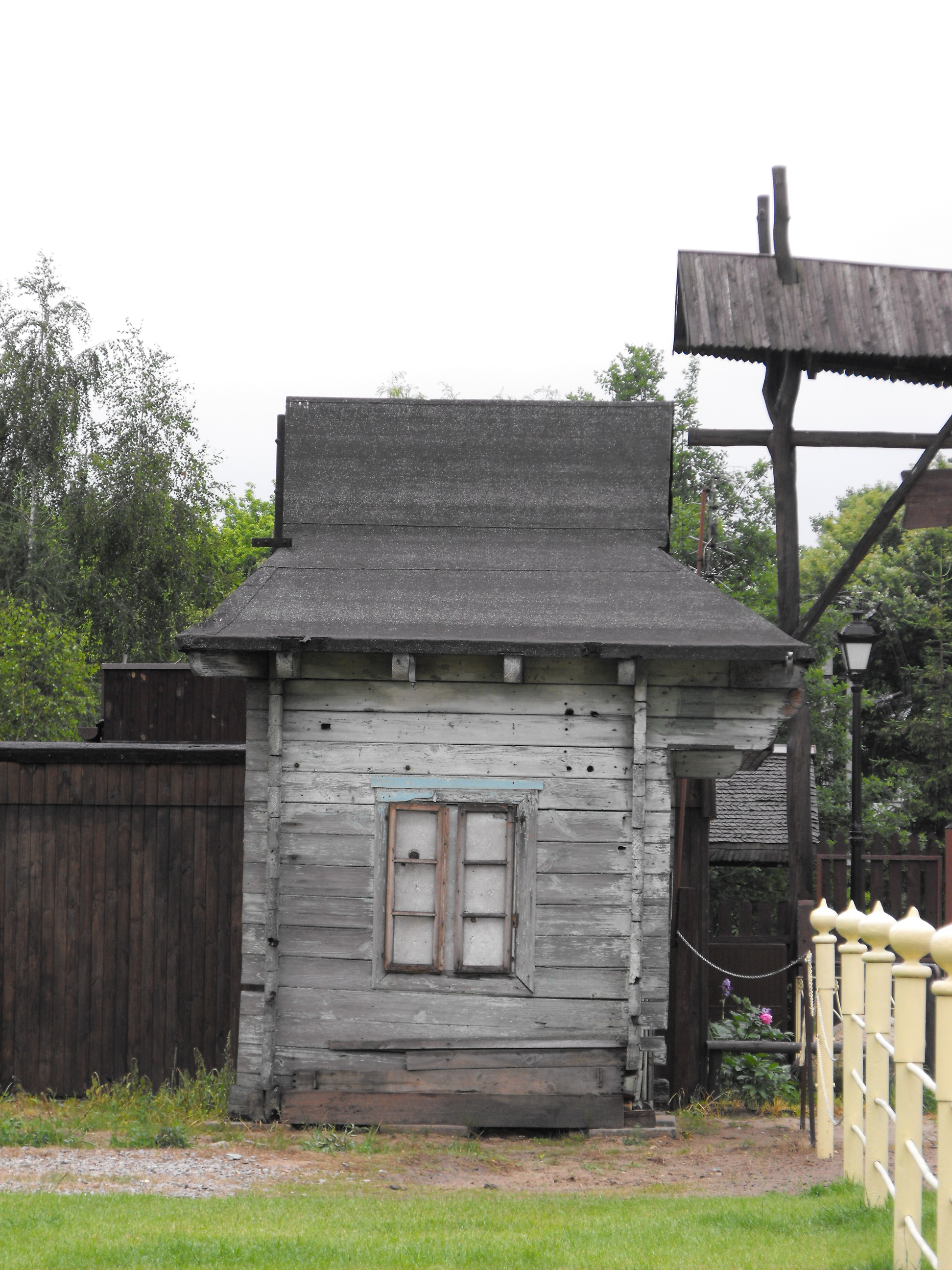Stróżówka cesarskiej gwardii ze wsi Spała. Obiekt przed renowacją. Budynek o konstrukcji zrębowej z mocno wysuniętymi trzema ostatnimi ostatkami dla podtrzymania dachu. Dach półszczytowy.