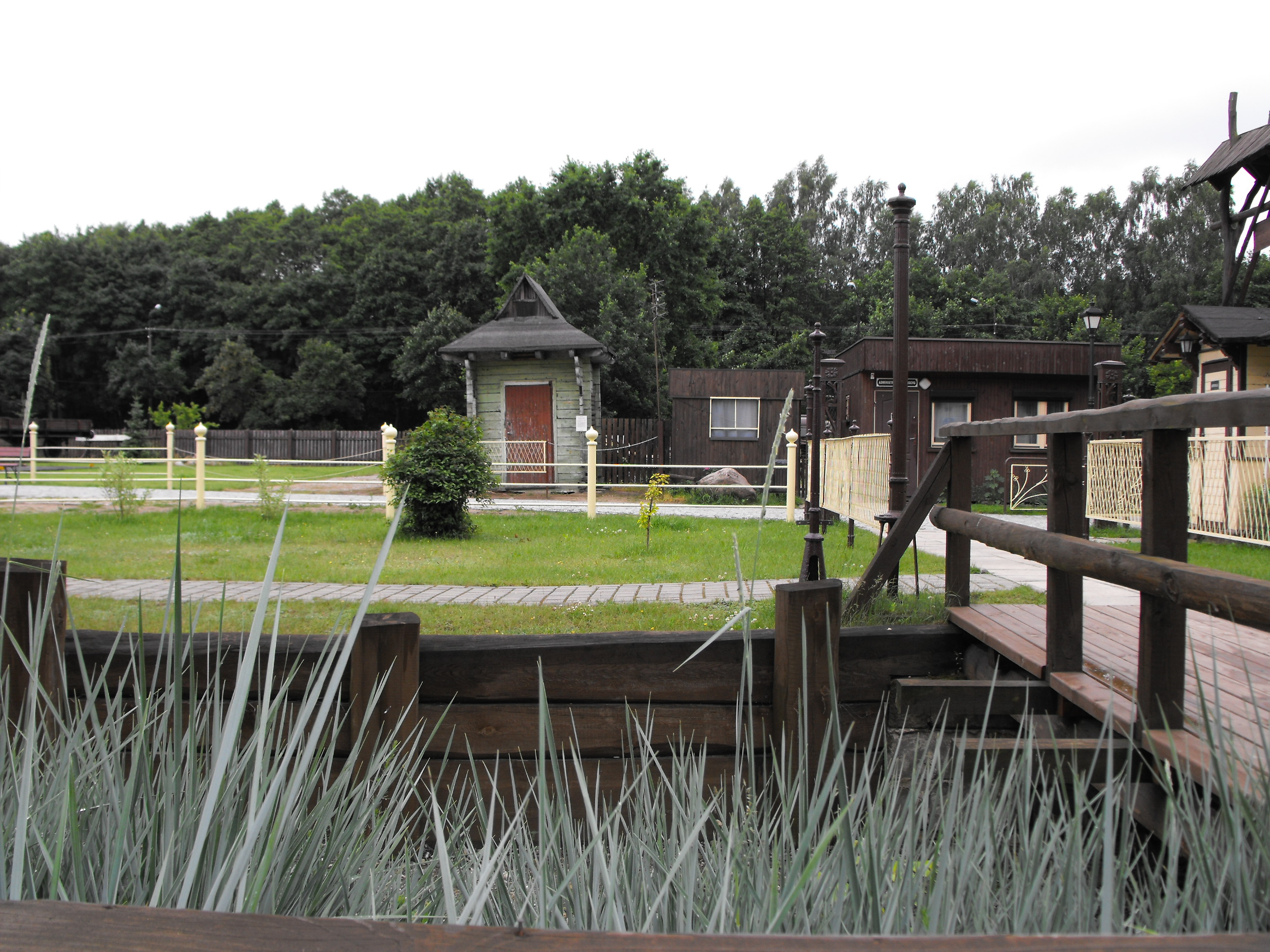 Widok sprzed młyna na teren skansenu. Na wprost stróżówka gwardii carskiej ze Spały.