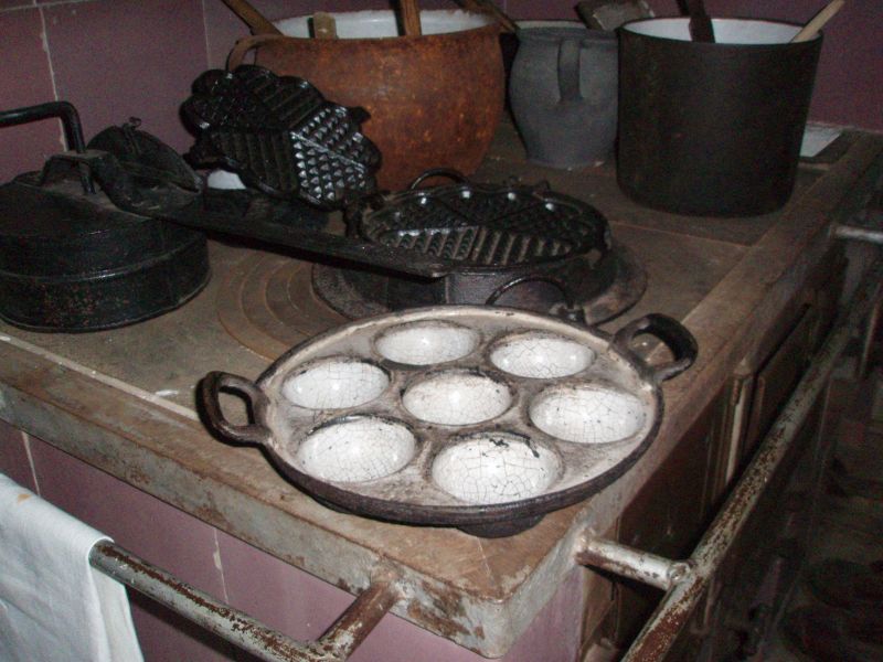 Kuchnia z paleniskiem zamkniętym pod płyta a na niej patelnia do jajek i maszyna do wypiekania gofrów.