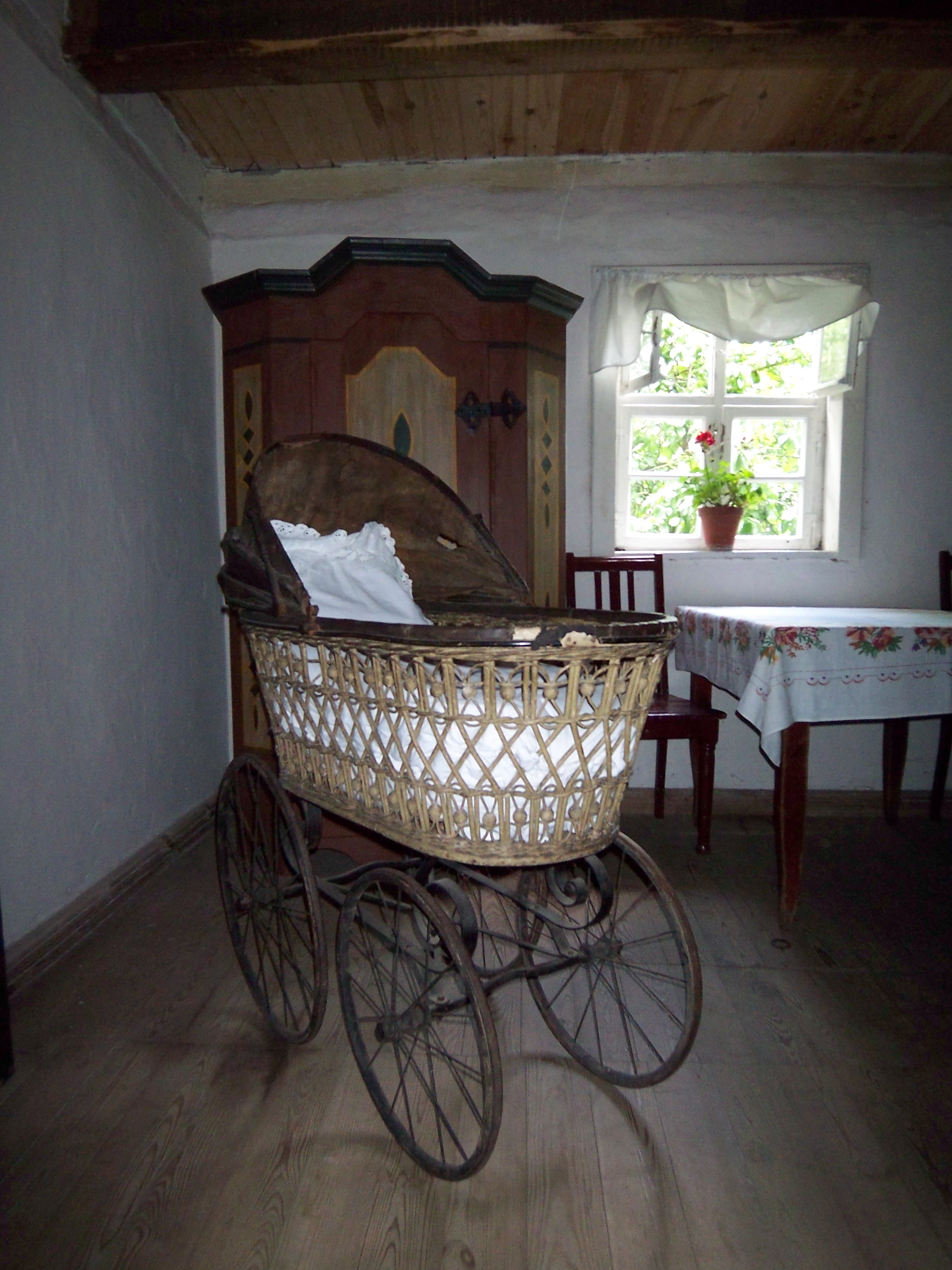 Wiklinowy wózek dziecięcy.